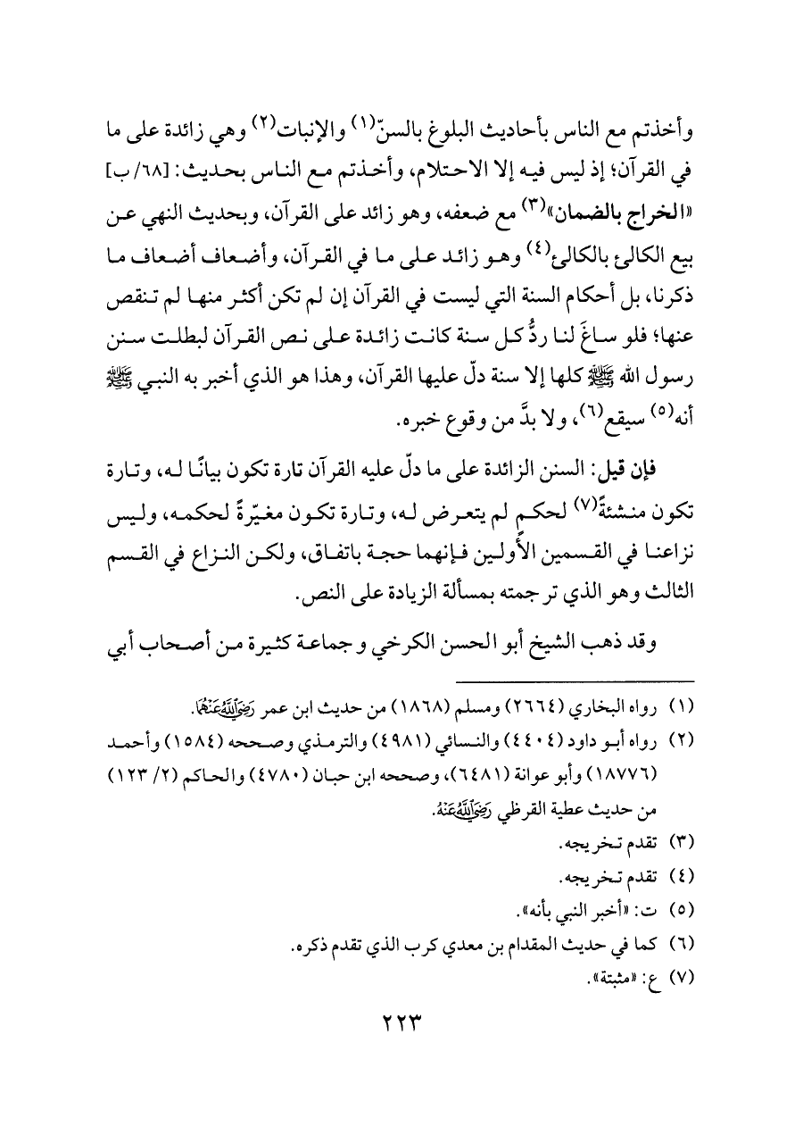وأخذتم مع الناس بأحاديث البلوغ بالسنّ (¬١) والإنبات (¬٢) وهي زائدة على ما في القرآن؛ إذ ليس فيه إلا الاحتلام، وأخذتم مع الناس بحديث: [٦٨/ب] «الخراج بالضمان» (¬٣) مع ضعفه، وهو زائد على القرآن، وبحديث النهي عن بيع الكالئ بالكالئ (¬٤) وهو زائد على ما في القرآن، وأضعاف أضعاف ما ذكرنا، بل أحكام السنة التي ليست في القرآن إن لم تكن أكثر منها لم تنقص عنها؛ فلو ساغَ لنا ردُّ كل سنة كانت زائدة على نص القرآن لبطلت سنن رسول الله - صلى الله عليه وسلم - كلها إلا سنة دلّ عليها القرآن، وهذا هو الذي أخبر به النبي - صلى الله عليه وسلم - أنه (¬٥) سيقع (¬٦)، ولا بدَّ من وقوع خبره.