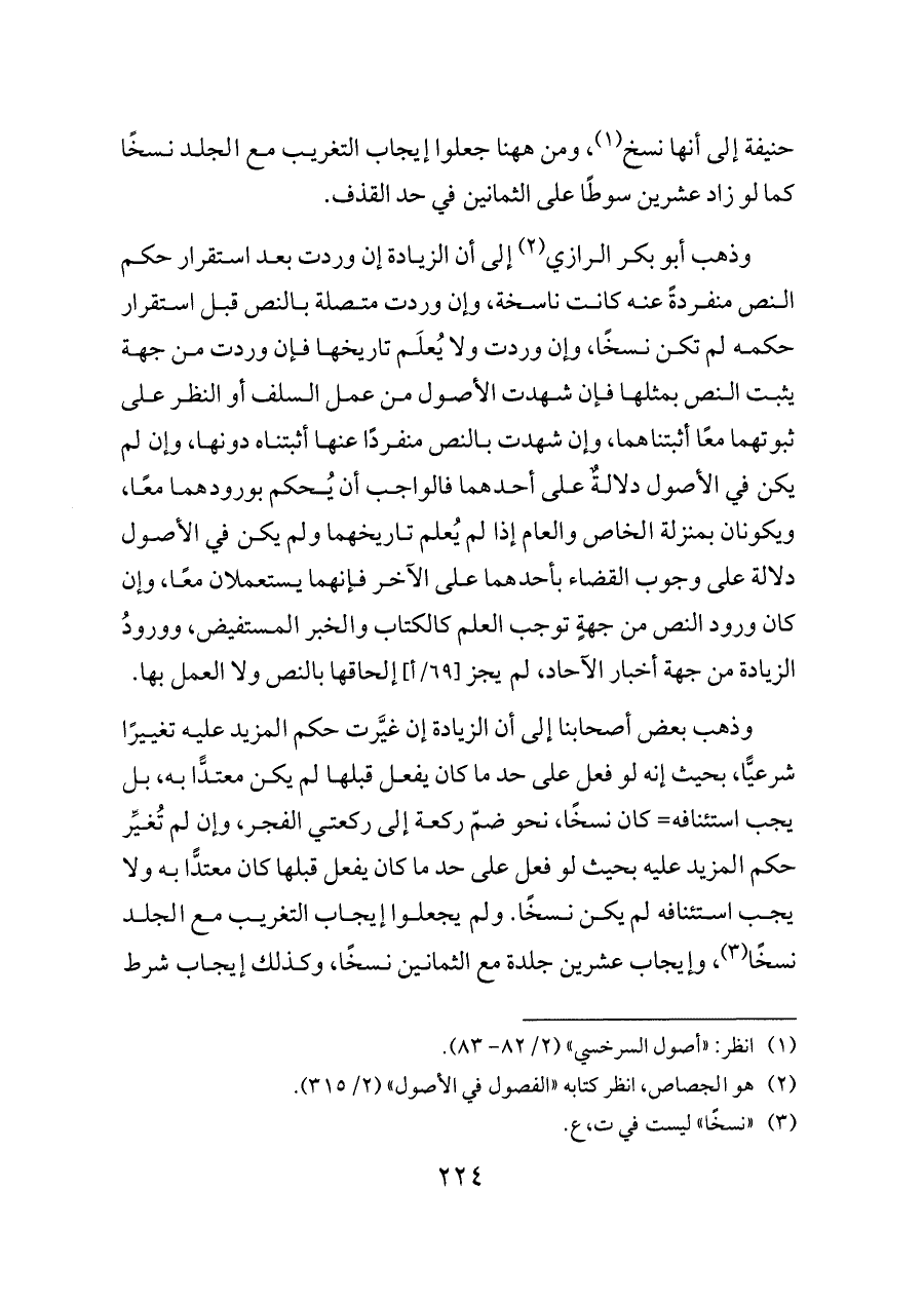 وذهب بعض أصحابنا إلى أن الزيادة إن غيَّرت حكم المزيد عليه تغييرًا شرعيًّا، بحيث إنه لو فعل على حد ما كان يفعل قبلها لم يكن معتدًّا به، بل يجب استئنافه= كان نسخًا، نحو ضمّ ركعة إلى ركعتي الفجر، وإن لم تُغيِّر حكم المزيد عليه بحيث لو فعل على حد ما كان يفعل قبلها كان معتدًّا به ولا يجب استئنافه لم يكن نسخًا. ولم يجعلوا إيجاب التغريب مع الجلد نسخًا (¬٣)، وإيجاب عشرين جلدة مع الثمانين نسخًا، وكذلك إيجاب شرط
