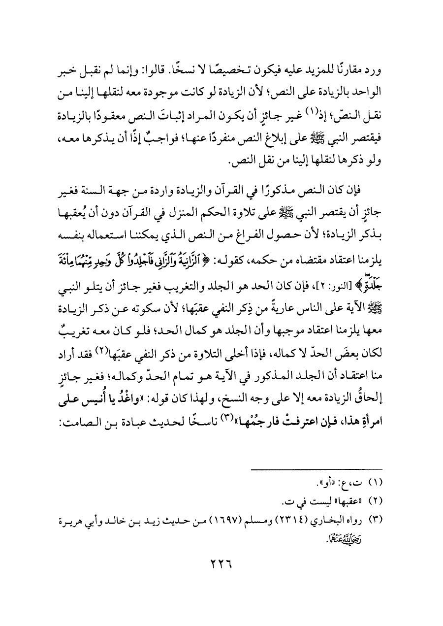 فإن كان النص مذكورًا في القرآن والزيادة واردة من جهة السنة فغير جائزٍ أن يقتصر النبي - صلى الله عليه وسلم - على تلاوة الحكم المنزل في القرآن دون أن يُعقبها بذكر الزيادة؛ لأن حصول الفراغ من النص الذي يمكننا استعماله بنفسه يلزمنا اعتقاد مقتضاه من حكمه، كقوله: {الزَّانِيَةُ وَالزَّانِي فَاجْلِدُوا كُلَّ وَاحِدٍ مِنْهُمَا مِائَةَ جَلْدَةٍ} [النور: ٢]، فإن كان الحد هو الجلد والتغريب فغير جائز أن يتلو النبي - صلى الله عليه وسلم - الآية على الناس عاريةً من ذِكر النفي عقبَها؛ لأن سكوته عن ذكر الزيادة معها يلزمنا اعتقاد موجبها وأن الجلد هو كمال الحد؛ فلو كان معه تغريبٌ لكان بعضَ الحدّ لا كماله، فإذا أخلى التلاوة من ذكر النفي عقبَها (¬٢) فقد أراد منا اعتقاد أن الجلد المذكور في الآية هو تمام الحدّ وكماله؛ فغير جائزٍ إلحاقُ الزيادة معه إلا على وجه النسخ، ولهذا كان قوله: «واغْدُ يا أُنيس على امرأةِ هذا، فإن اعترفتْ فارجُمْها» (¬٣) ناسخًا لحديث عبادة بن الصامت: