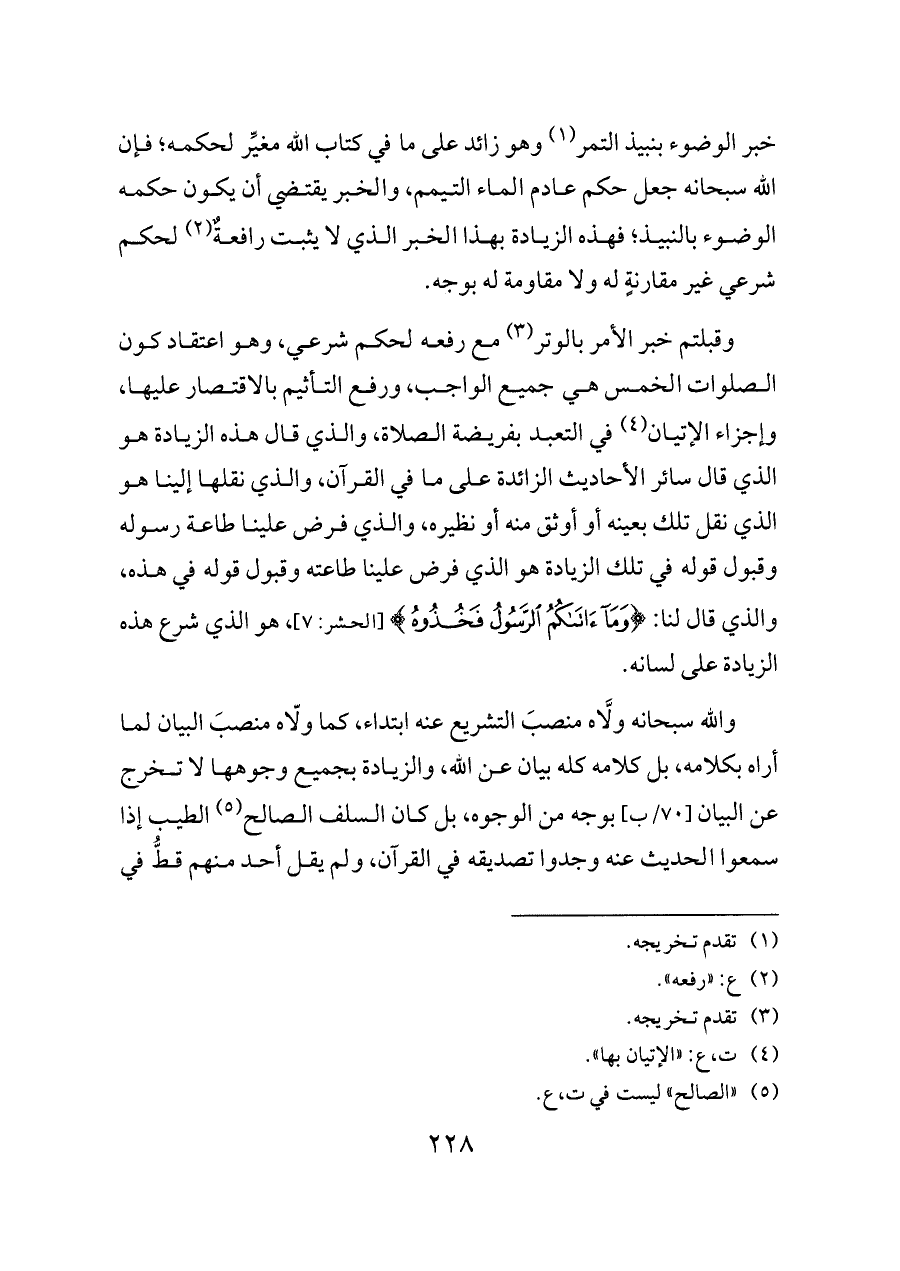 وقبلتم خبر الأمر بالوتر (¬٣) مع رفعه لحكم شرعي، وهو اعتقاد كون الصلوات الخمس هي جميع الواجب، ورفع التأثيم بالاقتصار عليها، وإجزاء الإتيان (¬٤) في التعبد بفريضة الصلاة، والذي قال هذه الزيادة هو الذي قال سائر الأحاديث الزائدة على ما في القرآن، والذي نقلها إلينا هو الذي نقل تلك بعينه أو أوثق منه أو نظيره، والذي فرض علينا طاعة رسوله وقبول قوله في تلك الزيادة هو الذي فرض علينا طاعته وقبول قوله في هذه، والذي قال لنا: {وَمَا آتَاكُمُ الرَّسُولُ فَخُذُوهُ} [الحشر: ٧]، هو الذي شرع هذه الزيادة على لسانه.