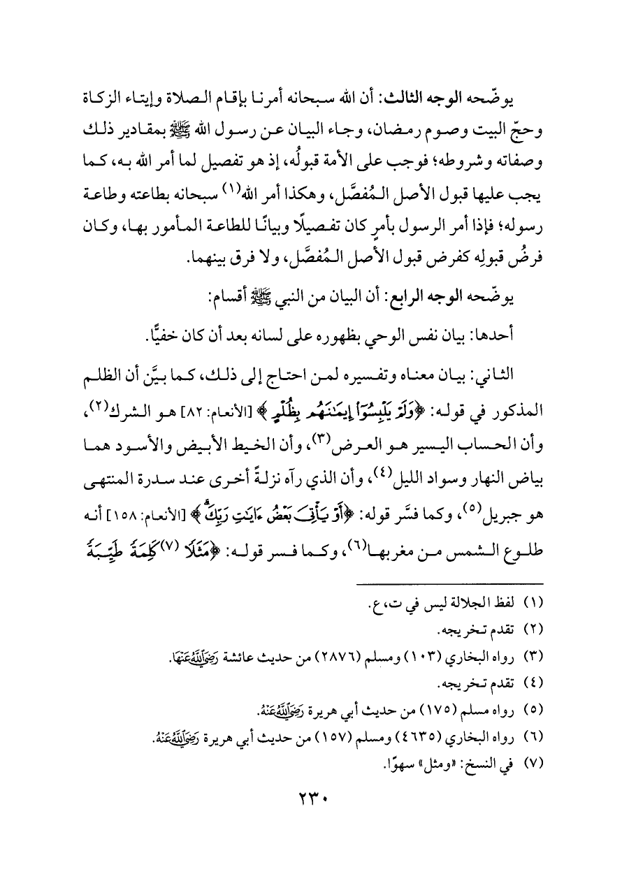 الثاني: بيان معناه وتفسيره لمن احتاج إلى ذلك، كما بيَّن أن الظلم المذكور في قوله: {وَلَمْ يَلْبِسُوا إِيمَانَهُمْ بِظُلْمٍ} [الأنعام: ٨٢] هو الشرك (¬٢)، وأن الحساب اليسير هو العرض (¬٣)، وأن الخيط الأبيض والأسود هما بياض النهار وسواد الليل (¬٤)، وأن الذي رآه نزلةً أخرى عند سدرة المنتهى هو جبريل (¬٥)، وكما فسَّر قوله: {أَوْ يَأْتِيَ بَعْضُ آيَاتِ رَبِّكَ} [الأنعام: ١٥٨] أنه طلوع الشمس من مغربها (¬٦)، وكما فسر قوله: {مَثَلًا (¬٧) كَلِمَةً طَيِّبَةً
