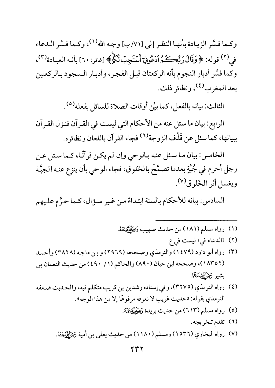 الخامس: بيان ما سئل عنه بالوحي وإن لم يكن قرآنًا، كما سئل عن رجل أحرم في جُبَّةٍ بعدما تضمَّخَ بالخَلوق، فجاء الوحي بأن ينزع عنه الجبَّة ويغسل أثر الخَلوق (¬٧).