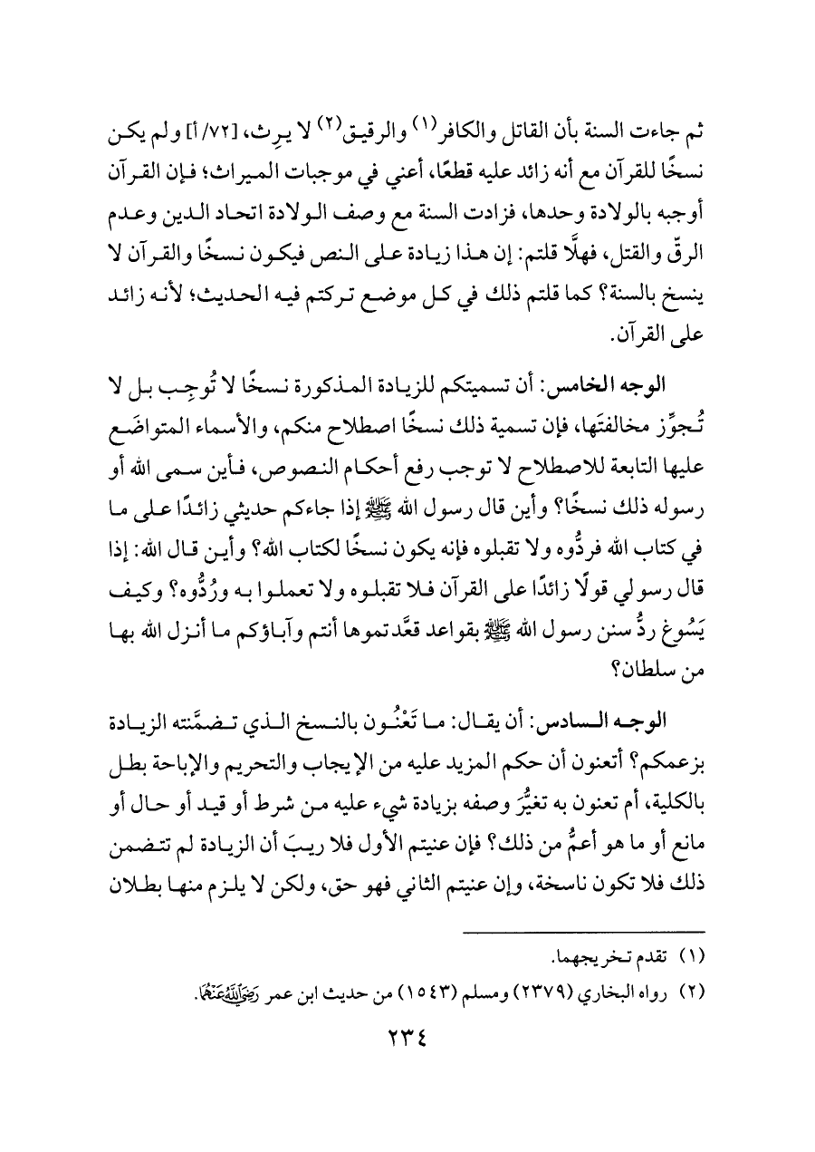 الوجه الخامس: أن تسميتكم للزيادة المذكورة نسخًا لا تُوجِب بل لا تُجوِّز مخالفتَها، فإن تسمية ذلك نسخًا اصطلاح منكم، والأسماء المتواضَع عليها التابعة للاصطلاح لا توجب رفع أحكام النصوص، فأين سمى الله أو رسوله ذلك نسخًا؟ وأين قال رسول الله - صلى الله عليه وسلم - إذا جاءكم حديثي زائدًا على ما في كتاب الله فردُّوه ولا تقبلوه فإنه يكون نسخًا لكتاب الله؟ وأين قال الله: إذا قال رسولي قولًا زائدًا على القرآن فلا تقبلوه ولا تعملوا به ورُدُّوه؟ وكيف يَسُوغ ردُّ سنن رسول الله - صلى الله عليه وسلم - بقواعد قعَّدتموها أنتم وآباؤكم ما أنزل الله بها من سلطان؟