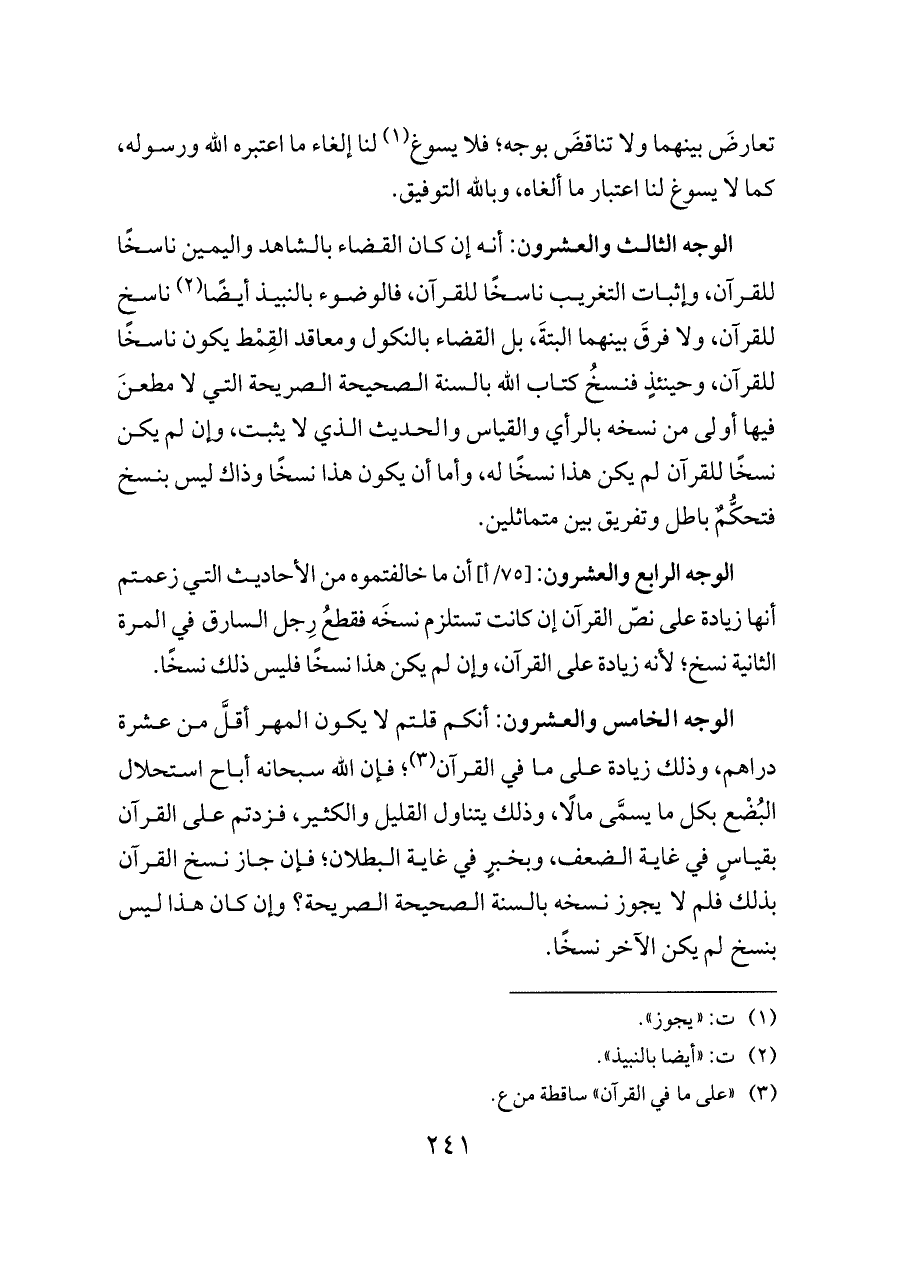 الوجه الرابع والعشرون: [٧٥/أ] أن ما خالفتموه من الأحاديث التي زعمتم أنها زيادة على نصّ القرآن إن كانت تستلزم نسخَه فقطعُ رِجل السارق في المرة الثانية نسخ؛ لأنه زيادة على القرآن، وإن لم يكن هذا نسخًا فليس ذلك نسخًا.