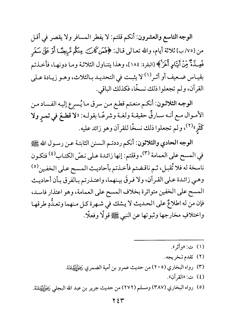 الوجه التاسع والعشرون: أنكم قلتم: لا يفطر المسافر ولا يقصر في أقل من [٧٥/ب] ثلاثة أيام، والله تعالى قال: {فَمَنْ كَانَ مِنْكُمْ مَرِيضًا أَوْ عَلَى سَفَرٍ فَعِدَّةٌ مِنْ أَيَّامٍ أُخَرَ} [البقرة: ١٨٤]، وهذا يتناول الثلاثة وما دونها، فأخذتم بقياس ضعيف أو أثر (¬١) لا يثبت في التحديد بالثلاث، وهو زيادة على القرآن، ولم تجعلوا ذلك نسخًا، فكذلك الباقي.