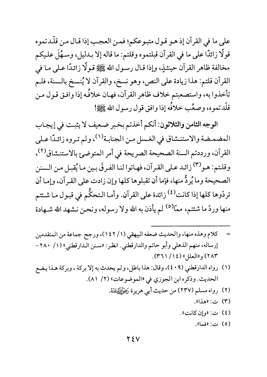 الوجه الثامن والثلاثون: أنكم أخذتم بخبر ضعيف لا يثبت في إيجاب المضمضة والاستنشاق في الغسل من الجنابة (¬١)، ولم تروه زائدًا على القرآن، ورددتم السنة الصحيحة الصريحة في أمر المتوضئ بالاستنشاق (¬٢)، وقلتم: هو (¬٣) زائد على القرآن، فهاتوا لنا الفرقَ بين ما يُقبل من السنن الصحيحة وما يُردُّ منها، فإما أن تقبلوها كلها وإن زادت على القرآن، وإما أن تردّوها كلها إذا كانت (¬٤) زائدة على القرآن. وأما التحكُّم في قبول ما شئتم منها وردّ ما شئتم، ممّا (¬٥) لم يأذن به الله ولا رسوله، ونحن نشهد الله شهادة