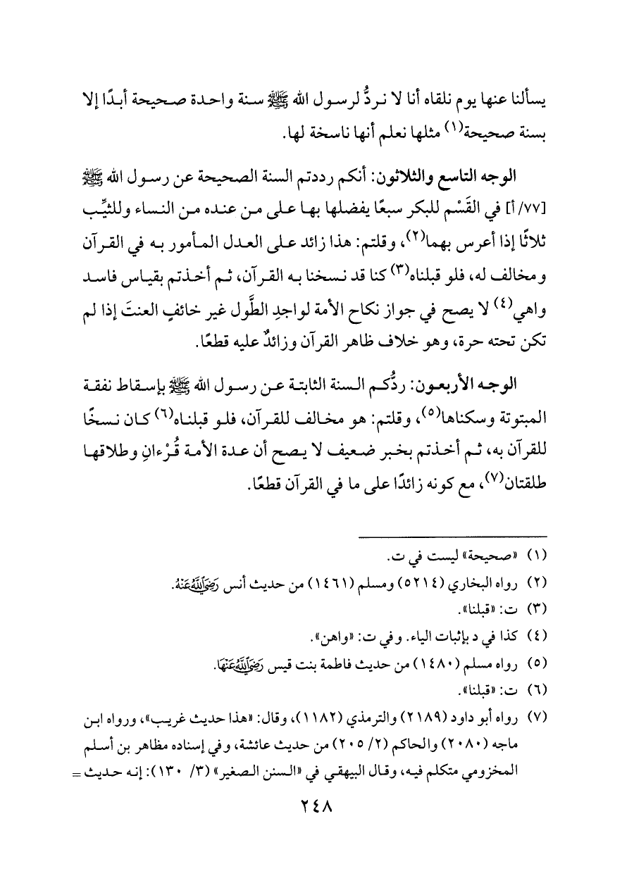 يسألنا عنها يوم نلقاه أنا لا نردُّ لرسول الله - صلى الله عليه وسلم - سنة واحدة صحيحة أبدًا إلا بسنة صحيحة (¬١) مثلها نعلم أنها ناسخة لها.