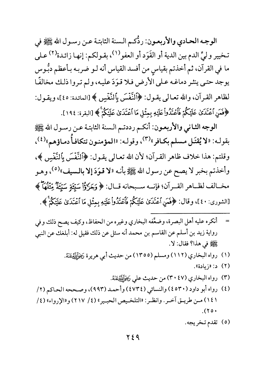الوجه الثاني والأربعون: أنكم رددتم السنة الثابتة عن رسول الله - صلى الله عليه وسلم - بقوله: «لا يُقتَل مسلم بكافر» (¬٣)، وقوله: «المؤمنون تتكافأُ دماؤهم» (¬٤)، وقلتم: هذا خلاف ظاهر القرآن؛ لأن الله تعالى يقول: {النَّفْسَ بِالنَّفْسِ}، وأخذتم بخبر لا يصح عن رسول الله - صلى الله عليه وسلم - بأنه «لا قوَدَ إلا بالسيف» (¬٥)، وهو مخالف لظاهر القرآن؛ فإنه سبحانه قال: {وَجَزَاءُ سَيِّئَةٍ سَيِّئَةٌ مِثْلُهَا} [الشورى: ٤٠]، وقال: {فَمَنِ اعْتَدَى عَلَيْكُمْ فَاعْتَدُوا عَلَيْهِ بِمِثْلِ مَا اعْتَدَى عَلَيْكُمْ}.