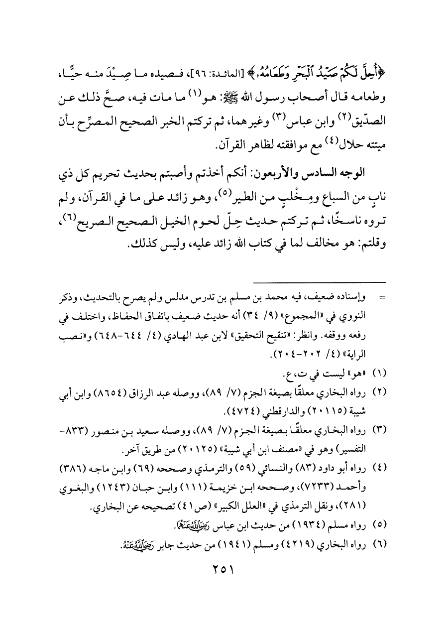 {أُحِلَّ لَكُمْ صَيْدُ الْبَحْرِ وَطَعَامُهُ} [المائدة: ٩٦]، فصيده ما صِيْدَ منه حيًّا، وطعامه قال أصحاب رسول الله - صلى الله عليه وسلم -: هو (¬١) ما مات فيه، صحَّ ذلك عن الصدّيق (¬٢) وابن عباس (¬٣) وغيرهما، ثم تركتم الخبر الصحيح المصرِّح بأن ميتته حلال (¬٤) مع موافقته لظاهر القرآن.