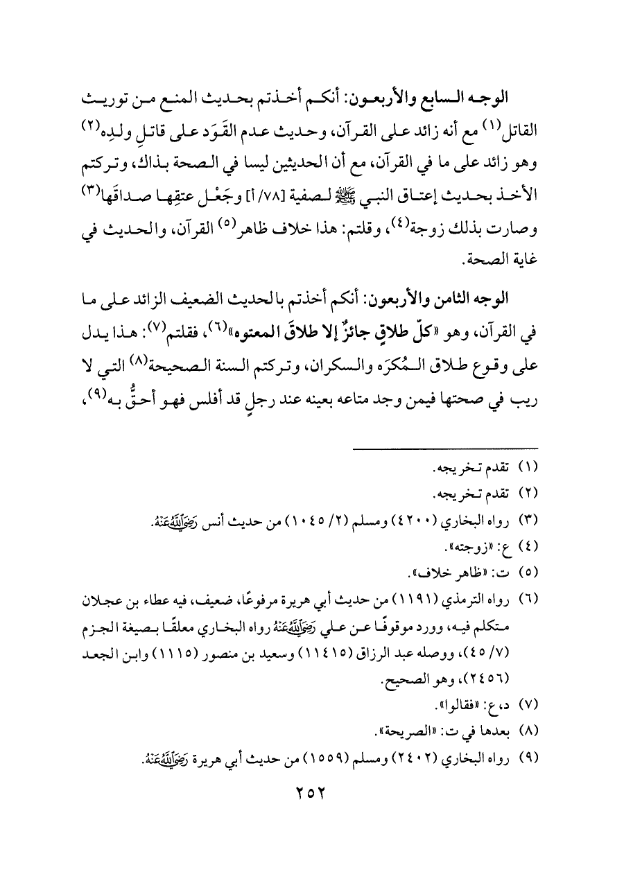 الوجه السابع والأربعون: أنكم أخذتم بحديث المنع من توريث القاتل (¬١) مع أنه زائد على القرآن، وحديث عدم القَوَد على قاتلِ ولدِه (¬٢) وهو زائد على ما في القرآن، مع أن الحديثين ليسا في الصحة بذاك، وتركتم الأخذ بحديث إعتاق النبي - صلى الله عليه وسلم - لصفية [٧٨/أ] وجَعْل عتقِها صداقَها (¬٣) وصارت بذلك زوجة (¬٤)، وقلتم: هذا خلاف ظاهر (¬٥) القرآن، والحديث في غاية الصحة.