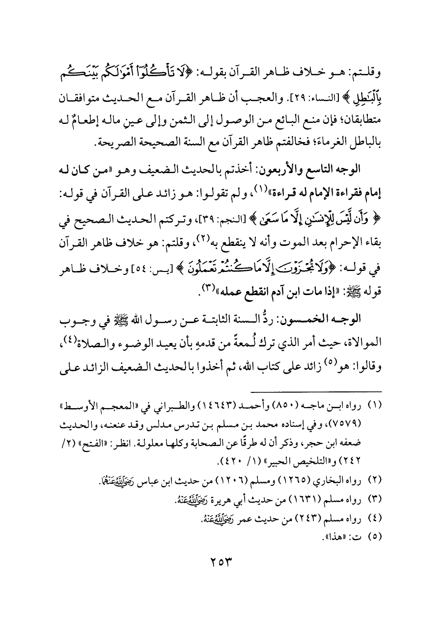 الوجه التاسع والأربعون: أخذتم بالحديث الضعيف وهو «من كان له إمام فقراءة الإمام له قراءة» (¬١)، ولم تقولوا: هو زائد على القرآن في قوله: {وَأَنْ لَيْسَ لِلْإِنْسَانِ إِلَّا مَا سَعَى} [النجم: ٣٩]، وتركتم الحديث الصحيح في بقاء الإحرام بعد الموت وأنه لا ينقطع به (¬٢)، وقلتم: هو خلاف ظاهر القرآن في قوله: {وَلَا تُجْزَوْنَ إِلَّا مَا كُنْتُمْ تَعْمَلُونَ} [يس: ٥٤] وخلاف ظاهر قوله - صلى الله عليه وسلم -: «إذا مات ابن آدم انقطع عمله» (¬٣).