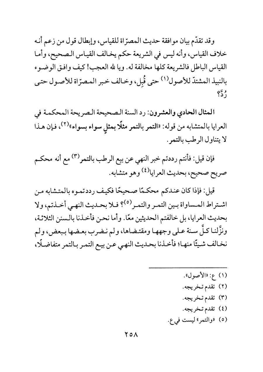 قيل: فإذا كان عندكم محكمًا صحيحًا فكيف رددتموه بالمتشابه من اشتراط المساواة بين التمر والتمر (¬٥)؟ فلا بحديث النهي أخذتم، ولا بحديث العرايا، بل خالفتم الحديثين معًا. وأما نحن فأخذنا بالسنن الثلاثة، ونزَّلنا كلَّ سنة على وجهها ومقتضاها، ولم نضرب بعضها ببعض، ولم نخالف شيئًا منها؛ فأخذنا بحديث النهي عن بيع التمر بالتمر متفاضلًا،