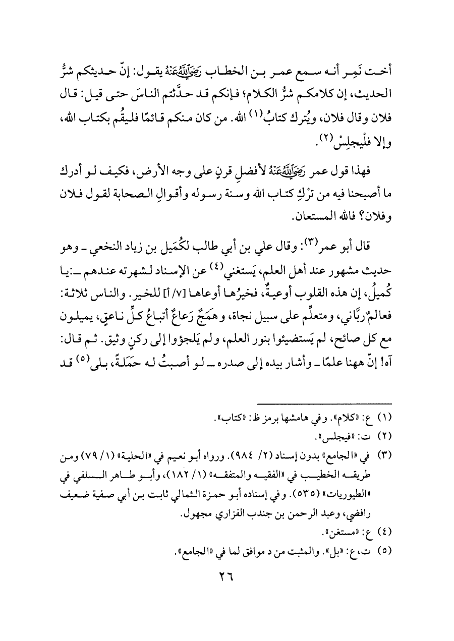 قال أبو عمر (¬٣): وقال علي بن أبي طالب لكُمَيل بن زياد النخعي ــ وهو حديث مشهور عند أهل العلم، يَستغني (¬٤) عن الإسناد لشهرته عندهم ــ: يا كُميلُ، إن هذه القلوب أوعيةٌ، فخيرُها أوعاها [٧/أ] للخير. والناس ثلاثة: فعالمٌ ربَّاني، ومتعلِّم على سبيل نجاة، وهَمَجٌ رَعاعٌ أتباعُ كلِّ ناعقٍ، يميلون مع كل صائح، لم يَستضيئوا بنور العلم، ولم يَلجؤوا إلى ركنٍ وثيق. ثم قال: آه! إنّ ههنا علمًا ــ وأشار بيده إلى صدره ــ لو أصبتُ له حَمَلةً، بلى (¬٥) قد