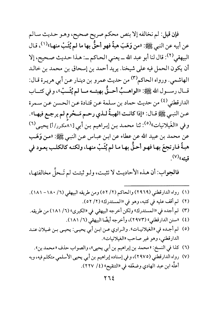 فإن قيل: لم نخالفه إلا بنص محكم صريح صحيح، وهو حديث سالم عن أبيه عن النبي - صلى الله عليه وسلم -: «من وَهَبَ هبةً فهو أحقُّ بها ما لم يُثَبْ منها» (¬١)، قال البيهقي (¬٢): قال لنا أبو عبد الله ــ يعني الحاكم ــ: هذا حديث صحيح، إلا أن يكون الحمل فيه على شيخنا. يريد أحمد بن إسحاق بن محمد بن خالد الهاشمي. ورواه الحاكم (¬٣) من حديث عمرو بن دينار عن أبي هريرة قال: قال رسول الله - صلى الله عليه وسلم -: «الواهبُ أحقُّ بهبته ما لم يُثَبْ»، وفي كتاب الدارقطني (¬٤) من حديث حماد بن سلمة عن قتادة عن الحسن عن سمرة عن النبي - صلى الله عليه وسلم - قال: «إذا كانت الهبةُ لذي رحم مَحْرمٍ لم يرجع فيها». وفي «الغَيلانيات» (¬٥): ثنا محمد بن إبراهيم بن أبي [٨١ مكرر/أ] يحيى (¬٦) عن محمد بن عبيد الله عن عطاء عن ابن عباس عن النبي - صلى الله عليه وسلم -: «من وَهَب هبةً فارتجعَ بها فهو أحقُّ بها ما لم يُثَبْ منها، ولكنه كالكلب يعود في قيئه» (¬٧).