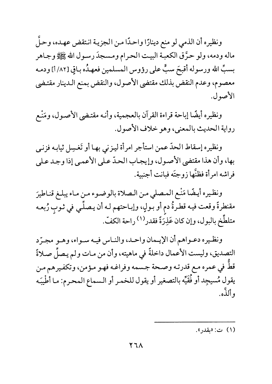 ونظيره أن الذمي لو منع دينارًا واحدًا من الجزية انتقض عهده، وحلَّ ماله ودمه، ولو حرَّق الكعبة البيت الحرام ومسجدَ رسول الله - صلى الله عليه وسلم - وجاهر بسبِّ الله ورسوله أقبحَ سبٍّ على رؤوس المسلمين فعهدُه باقٍ [٨٢/أ] ودمه معصوم، وعدم النقض بذلك مقتضى الأصول، والنقض بمنع الدينار مقتضى الأصول.