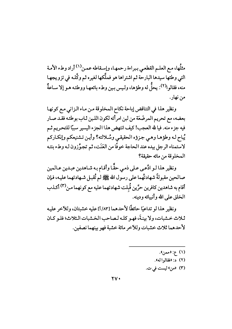 ونظير هذا في التناقض إباحة نكاح المخلوقة من ماء الزاني مع كونها بعضه، مع تحريم المرضَعَة من لبن امرأته لكون اللبن ثاب بوطئه فقد صار فيه جزء منه. فيا لله العجب! كيف انتهض هذا الجزء اليسير سببًا للتحريم ثم يُباح له وطؤها وهي جزؤه الحقيقي وسُلالته؟ وأين تشنيعكم وإنكاركم لاستمناء الرجل بيده عند الحاجة خوفًا من العَنَت، ثم تجوِّزون له وطء بنته المخلوقة من مائه حقيقة؟