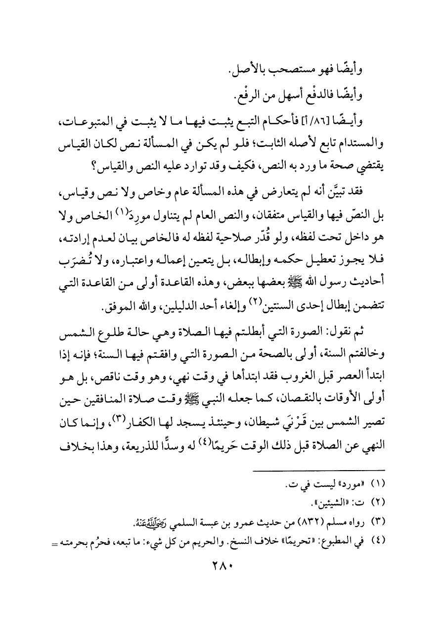 ثم نقول: الصورة التي أبطلتم فيها الصلاة وهي حالة طلوع الشمس وخالفتم السنة، أولى بالصحة من الصورة التي وافقتم فيها السنة؛ فإنه إذا ابتدأ العصر قبل الغروب فقد ابتدأها في وقت نهي، وهو وقت ناقص، بل هو أولى الأوقات بالنقصان، كما جعله النبي - صلى الله عليه وسلم - وقت صلاة المنافقين حين تصير الشمس بين قَرْنَي شيطان، وحينئذ يسجد لها الكفار (¬٣)، وإنما كان النهي عن الصلاة قبل ذلك الوقت حَريمًا (¬٤) له وسدًّا للذريعة، وهذا بخلاف