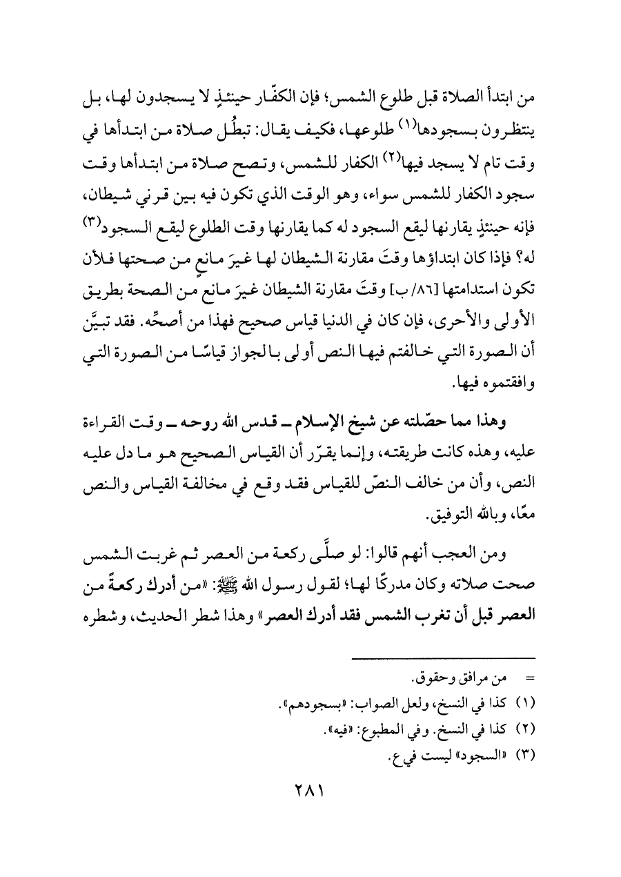 ومن العجب أنهم قالوا: لو صلَّى ركعة من العصر ثم غربت الشمس صحت صلاته وكان مدركًا لها؛ لقول رسول الله - صلى الله عليه وسلم -: «من أدرك ركعةً من العصر قبل أن تغرب الشمس فقد أدرك العصر» وهذا شطر الحديث، وشطره