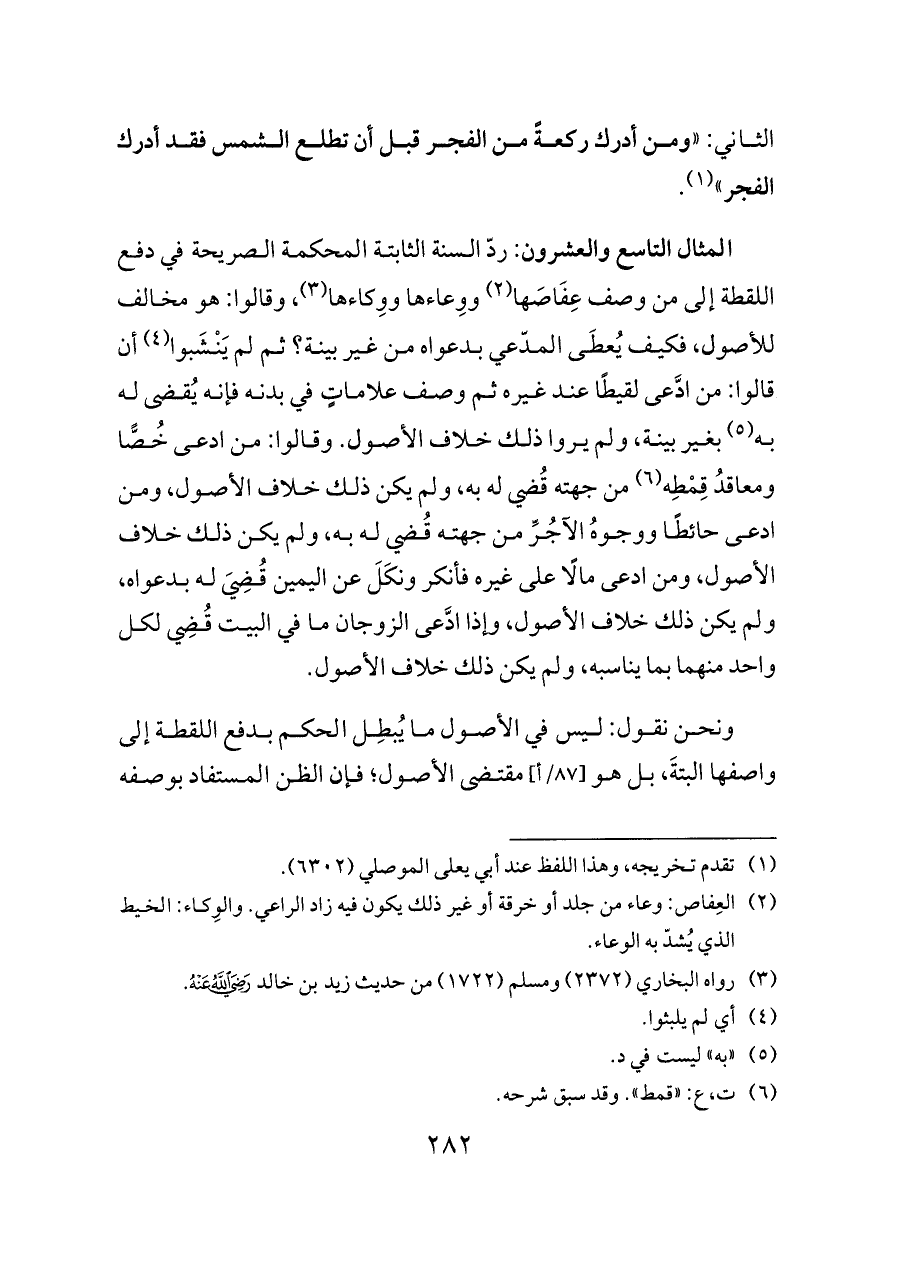 المثال التاسع والعشرون: ردّ السنة الثابتة المحكمة الصريحة في دفع اللقطة إلى من وصف عِفَاصَها (¬٢) ووِعاءها ووِكاءها (¬٣)، وقالوا: هو مخالف للأصول، فكيف يُعطَى المدّعي بدعواه من غير بينة؟ ثم لم يَنْشَبوا (¬٤) أن قالوا: من ادَّعى لقيطًا عند غيره ثم وصف علاماتٍ في بدنه فإنه يُقضى له به (¬٥) بغير بينة، ولم يروا ذلك خلاف الأصول. وقالوا: من ادعى خُصًّا ومعاقدُ قِمْطِه (¬٦) من جهته قُضي له به، ولم يكن ذلك خلاف الأصول، ومن ادعى حائطًا ووجوهُ الآجُرِّ من جهته قُضي له به، ولم يكن ذلك خلاف الأصول، ومن ادعى مالًا على غيره فأنكر ونكَلَ عن اليمين قُضِيَ له بدعواه، ولم يكن ذلك خلاف الأصول، وإذا ادَّعى الزوجان ما في البيت قُضِي لكل واحد منهما بما يناسبه، ولم يكن ذلك خلاف الأصول.