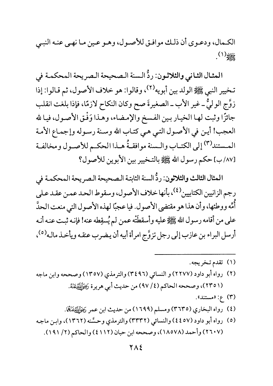 المثال الثالث والثلاثون: ردُّ السنة الثابتة الصحيحة الصريحة المحكمة في رجم الزانيين الكتابيين (¬٤)، بأنها خلاف الأصول، وسقوط الحد عمن عقد على أُمِّه ووطئها، وأن هذا هو مقتضى الأصول. فيا عجبًا لهذه الأصول التي منعت الحدَّ على من أقامه رسول الله - صلى الله عليه وسلم - عليه وأسقطَتْه عمن لم يُسقِطه عنه! فإنه ثبت عنه أنه أرسل البراء بن عازب إلى رجل تزوَّج امرأة أبيه أن يضرب عنقه ويأخذ ماله (¬٥)،