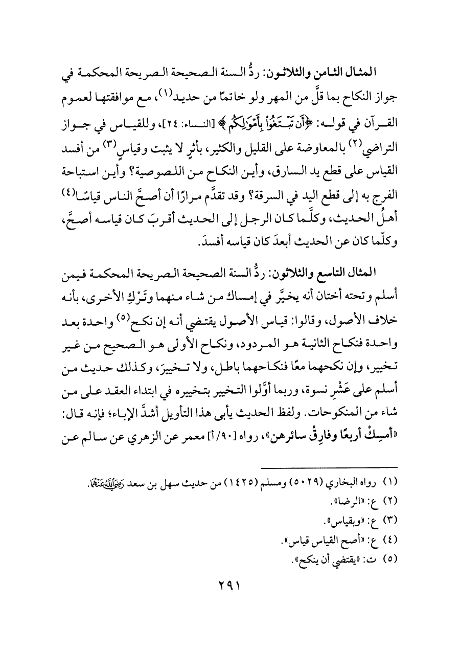 المثال التاسع والثلاثون: ردُّ السنة الصحيحة الصريحة المحكمة فيمن أسلم وتحته أختان أنه يخيَّر في إمساك من شاء منهما وتَرْكِ الأخرى، بأنه خلاف الأصول، وقالوا: قياس الأصول يقتضي أنه إن نكح (¬٥) واحدة بعد واحدة فنكاح الثانية هو المردود، ونكاح الأولى هو الصحيح من غير تخيير، وإن نكحهما معًا فنكاحهما باطل، ولا تخييرَ، وكذلك حديث من أسلم على عَشْرِ نسوة، وربما أوَّلوا التخيير بتخييره في ابتداء العقد على من شاء من المنكوحات. ولفظ الحديث يأبى هذا التأويل أشدَّ الإباء؛ فإنه قال: «أمسِكْ أربعًا وفارِقْ سائرهن»، رواه [٩٠/أ] معمر عن الزهري عن سالم عن