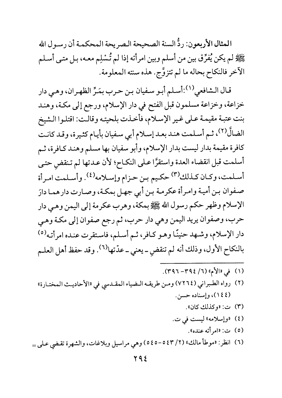 (¬٦) انظر: «موطأ مالك» (٢/ ٥٤٣ - ٥٤٥) وهي مراسيل وبلاغات، والشهرة تقضي على ذلك؛ لكونه معروفًا عند أهل المغازي كابرًا عن كابرٍ. قال الشافعي في «الأم»: ما وصفتُ لك من أمر أبي سفيان وحكيم بن حزام وأزواجهما، وأمر صفوان وعكرمة وأزواجهما أمر معروف عند أهل العلم بالمغازي. وروى البيهقي في «السنن الكبرى» (٧/ ١٨٦) عن الشافعي أنه قال: أخبرنا جماعة من أهل العلم من قريش وأهل المغازى وغيرهم عن عدد قبلهم ....