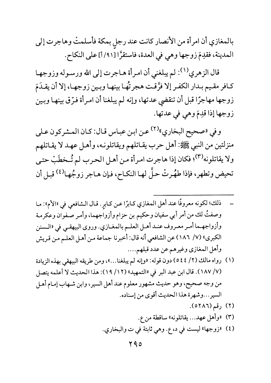 وفي «صحيح البخاري» (¬٢) عن ابن عباس قال: كان المشركون على منزلتين من النبي - صلى الله عليه وسلم -: أهل حرب يقاتلهم ويقاتلونه، وأهل عهد لا يقاتلهم ولا يقاتلونه (¬٣)؛ فكان إذا هاجرت امرأة من أهل الحرب لم تُخطَبْ حتى تحيض وتطهر، فإذا طهُرتْ حلَّ لها النكاح، فإن هاجر زوجُها (¬٤) قبل أن