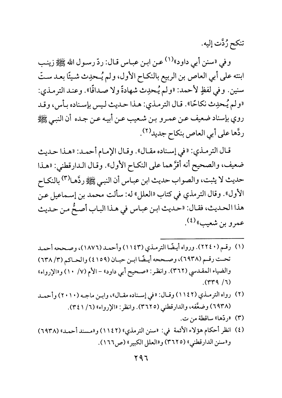 وفي «سنن أبي داود» (¬١) عن ابن عباس قال: ردّ رسول الله - صلى الله عليه وسلم - زينب ابنته على أبي العاص بن الربيع بالنكاح الأول، ولم يُحدِث شيئًا بعد ستّ سنين. وفي لفظٍ لأحمد: «ولم يُحدِث شهادةً ولا صداقًا». وعند الترمذي: «ولم يُحدِث نكاحًا». قال الترمذي: هذا حديث ليس بإسناده بأس، وقد روي بإسناد ضعيف عن عمرو بن شعيب عن أبيه عن جده أن النبي - صلى الله عليه وسلم - ردَّها على أبي العاص بنكاح جديد (¬٢).