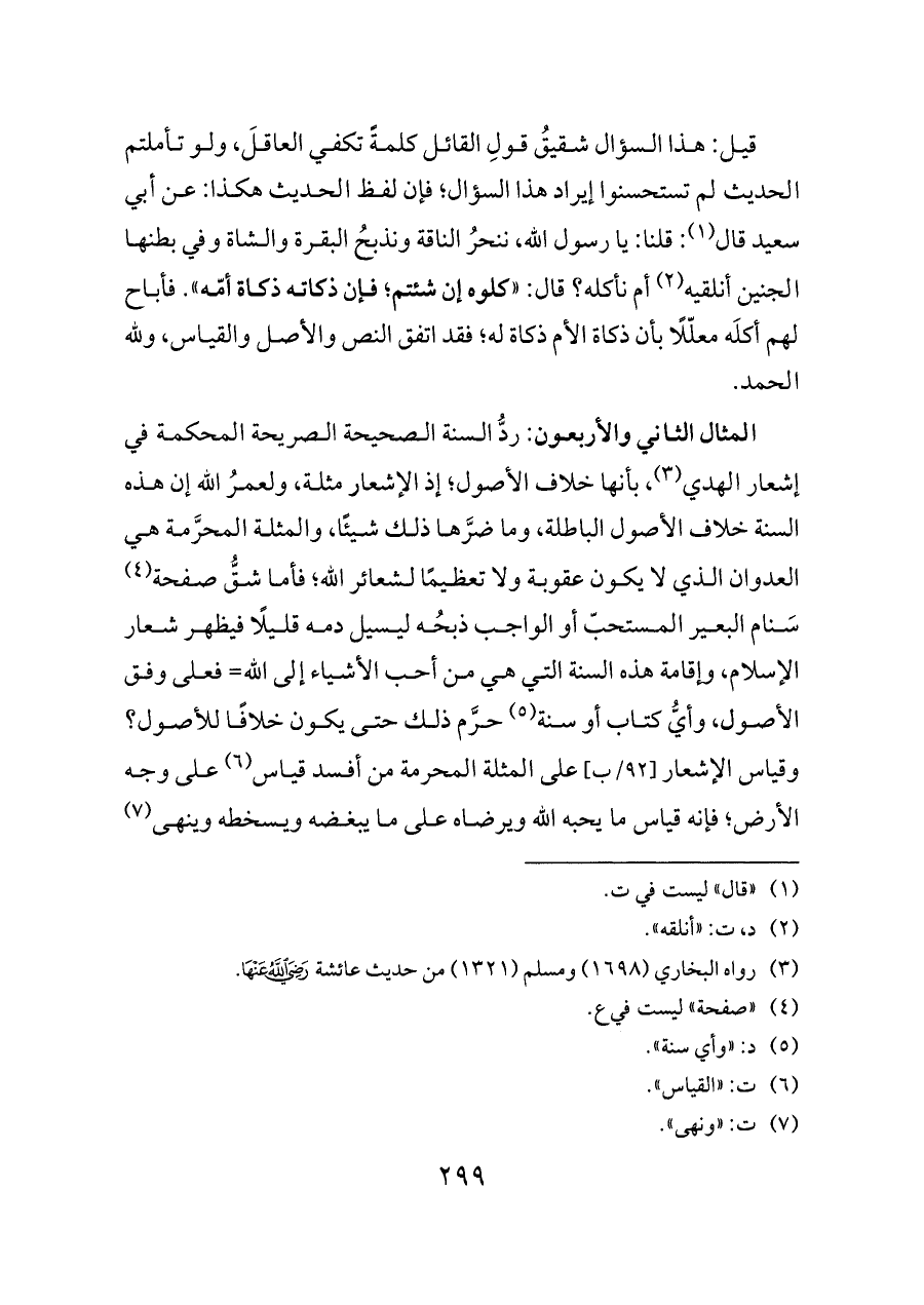 المثال الثاني والأربعون: ردُّ السنة الصحيحة الصريحة المحكمة في إشعار الهدي (¬٣)، بأنها خلاف الأصول؛ إذ الإشعار مثلة، ولعمرُ الله إن هذه السنة خلاف الأصول الباطلة، وما ضرَّها ذلك شيئًا، والمثلة المحرَّمة هي العدوان الذي لا يكون عقوبة ولا تعظيمًا لشعائر الله؛ فأما شقُّ صفحة (¬٤) سَنام البعير المستحبّ أو الواجب ذبحُه ليسيل دمه قليلًا فيظهر شعار الإسلام، وإقامة هذه السنة التي هي من أحب الأشياء إلى الله= فعلى وفق الأصول، وأيُّ كتاب أو سنة (¬٥) حرَّم ذلك حتى يكون خلافًا للأصول؟ وقياس الإشعار [٩٢/ب] على المثلة المحرمة من أفسد قياس (¬٦) على وجه الأرض؛ فإنه قياس ما يحبه الله ويرضاه على ما يبغضه ويسخطه وينهى (¬٧)