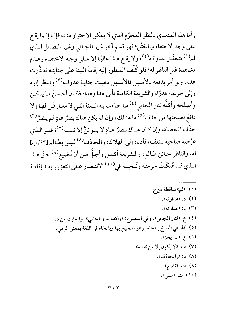 وأما هذا المتعدي بالنظر المحرّم الذي لا يمكن الاحتراز منه، فإنه إنما يقع على وجه الاختفاء والخَتْل؛ فهو قسم آخر غير الجاني وغير الصائل الذي لم (¬١) يتحقّق عدوانه (¬٢)، ولا يقع هذا غالبًا إلا على وجه الاختفاء وعدم مشاهدة غير الناظر له؛ فلو كُلِّف المنظور إليه إقامةَ البينة على جنايته تعذَّرت عليه، ولو أمر بدفعه بالأسهل فالأسهل ذهبت جناية عدوانه (¬٣) بالنظر إليه وإلى حريمه هدرًا، والشريعة الكاملة تأبى هذا وهذا؛ فكان أحسنُ ما يمكن وأصلحه وأكفُّه لنار الجاني (¬٤) ما جاءت به السنة التي لا معارضَ لها ولا دافعَ لصحتها من حذف (¬٥) ما هنالك، وإن لم يكن هناك بصرٌ عادٍ لم يضرَّ (¬٦) حَذْف الحصاة، وإن كان هناك بصرٌ عادٍ لا يلومَنَّ إلا نفسه (¬٧)؛ فهو الذي عرَّضه صاحبه للتلف، فأدناه إلى الهلاك، والحاذف (¬٨) ليس بظالم [٩٣/ب] له، والناظر خائن ظالم، والشريعة أكمل وأجلُّ من أن تُضيع (¬٩)