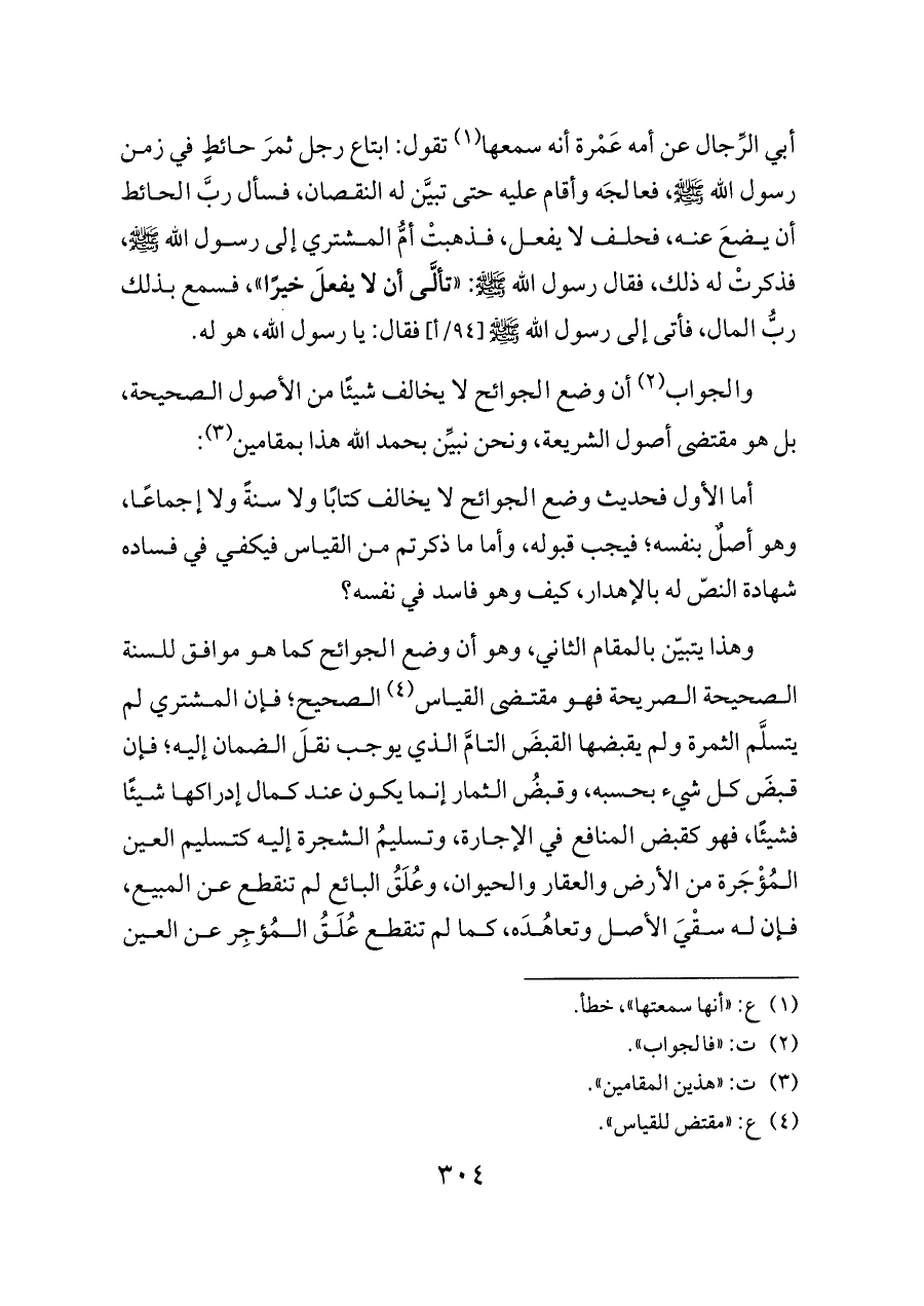 والجواب (¬٢) أن وضع الجوائح لا يخالف شيئًا من الأصول الصحيحة، بل هو مقتضى أصول الشريعة، ونحن نبيِّن بحمد الله هذا بمقامين (¬٣):