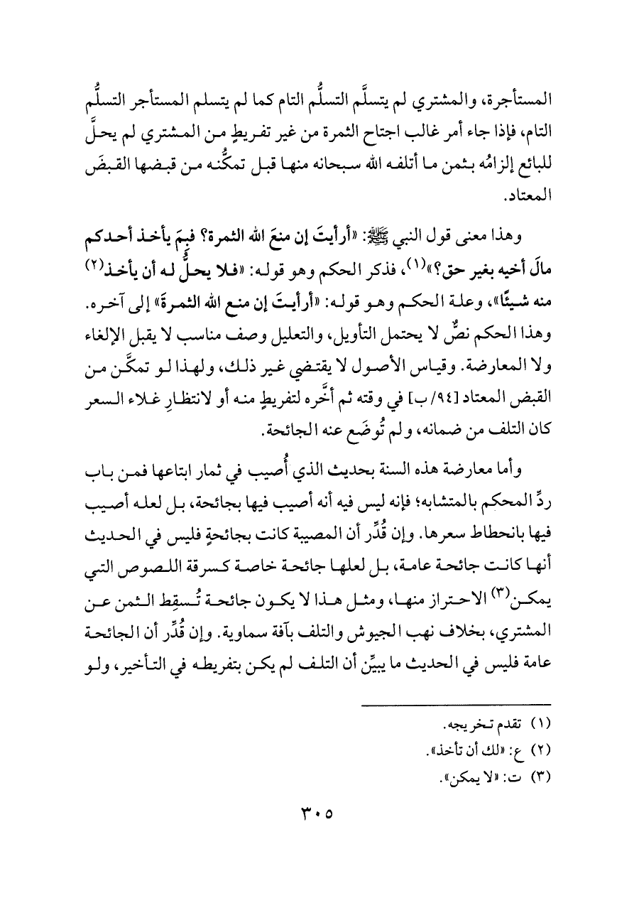 وهذا معنى قول النبي - صلى الله عليه وسلم -: «أرأيتَ إن منعَ الله الثمرة؟ فبِمَ يأخذ أحدكم مالَ أخيه بغير حق؟» (¬١)، فذكر الحكم وهو قوله: «فلا يحلُّ له أن يأخذ (¬٢) منه شيئًا»، وعلة الحكم وهو قوله: «أرأيتَ إن منع الله الثمرةَ» إلى آخره. وهذا الحكم نصٌّ لا يحتمل التأويل، والتعليل وصف مناسب لا يقبل الإلغاء ولا المعارضة. وقياس الأصول لا يقتضي غير ذلك، ولهذا لو تمكَّن من القبض المعتاد [٩٤/ب] في وقته ثم أخَّره لتفريطٍ منه أو لانتظارِ غلاء السعر كان التلف من ضمانه، ولم تُوضَع عنه الجائحة.