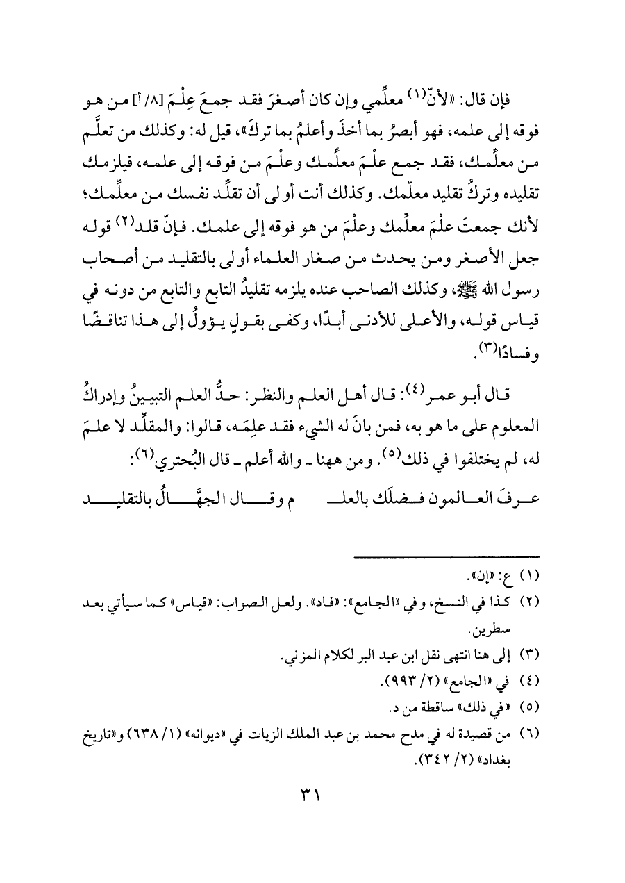 قال أبو عمر (¬٤): قال أهل العلم والنظر: حدُّ العلم التبيينُ وإدراكُ المعلوم على ما هو به، فمن بانَ له الشيء فقد علِمَه، قالوا: والمقلِّد لا علمَ له، لم يختلفوا في ذلك (¬٥). ومن ههنا ــ والله أعلم ــ قال البُحتري (¬٦):
