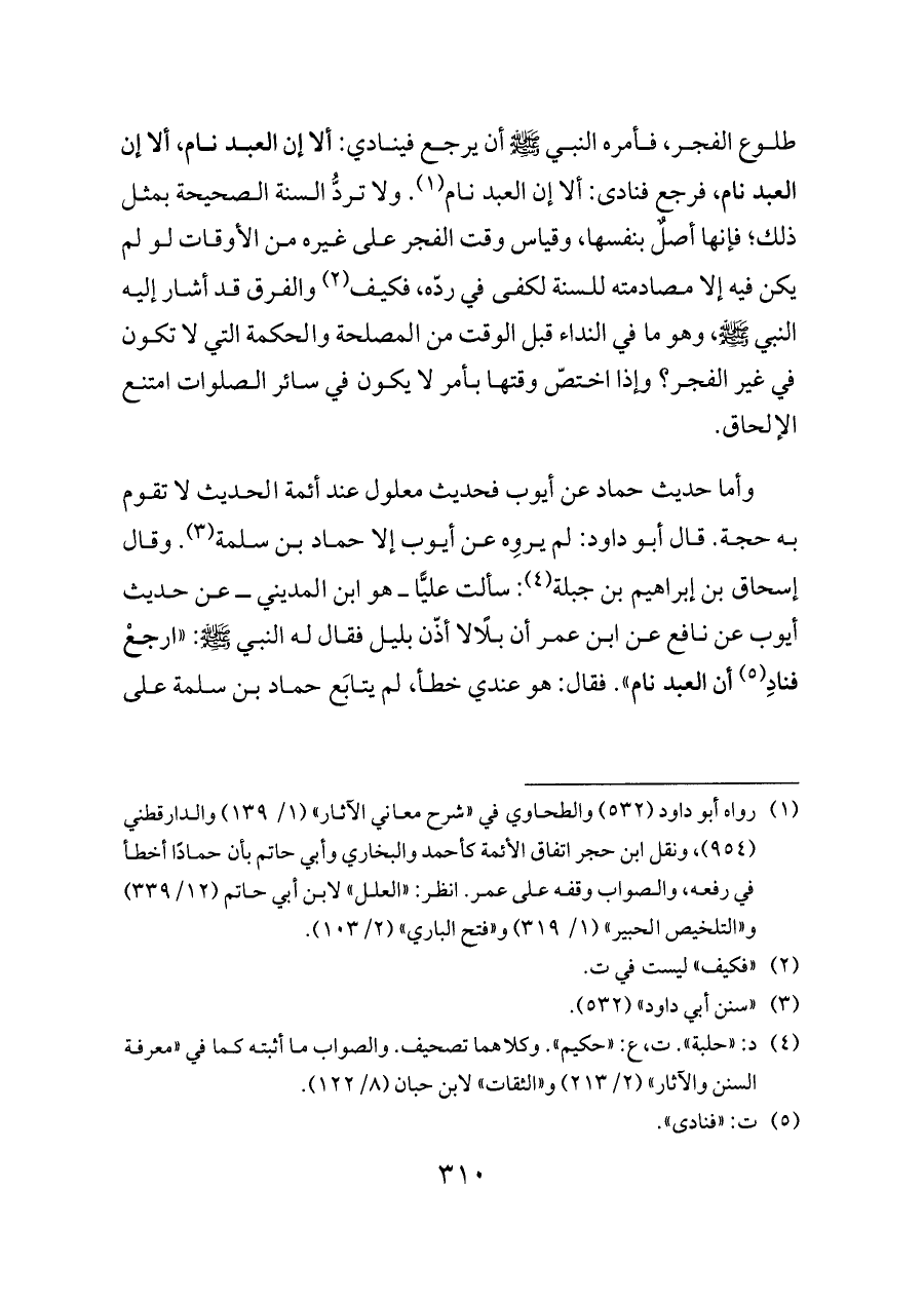 وأما حديث حماد عن أيوب فحديث معلول عند أئمة الحديث لا تقوم به حجة. قال أبو داود: لم يروِه عن أيوب إلا حماد بن سلمة (¬٣). وقال إسحاق بن إبراهيم بن جبلة (¬٤): سألت عليًّا ــ هو ابن المديني ــ عن حديث أيوب عن نافع عن ابن عمر أن بلًالا أذّن بليل فقال له النبي - صلى الله عليه وسلم -: «ارجعْ فنادِ (¬٥) أن العبد نام». فقال: هو عندي خطأ، لم يتابَع حماد بن سلمة على