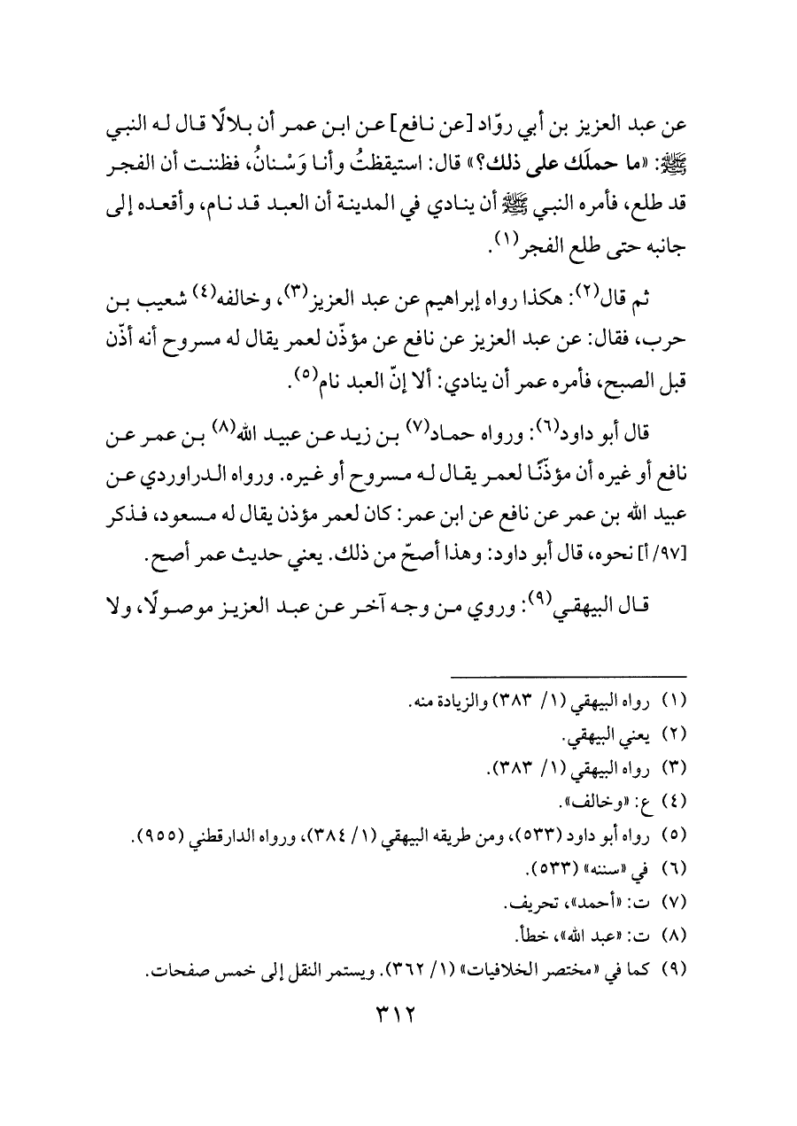 عن عبد العزيز بن أبي روّاد [عن نافع] عن ابن عمر أن بلالًا قال له النبي - صلى الله عليه وسلم -: «ما حملَك على ذلك؟» قال: استيقظتُ وأنا وَسْنانُ، فظننت أن الفجر قد طلع، فأمره النبي - صلى الله عليه وسلم - أن ينادي في المدينة أن العبد قد نام، وأقعده إلى جانبه حتى طلع الفجر (¬١).