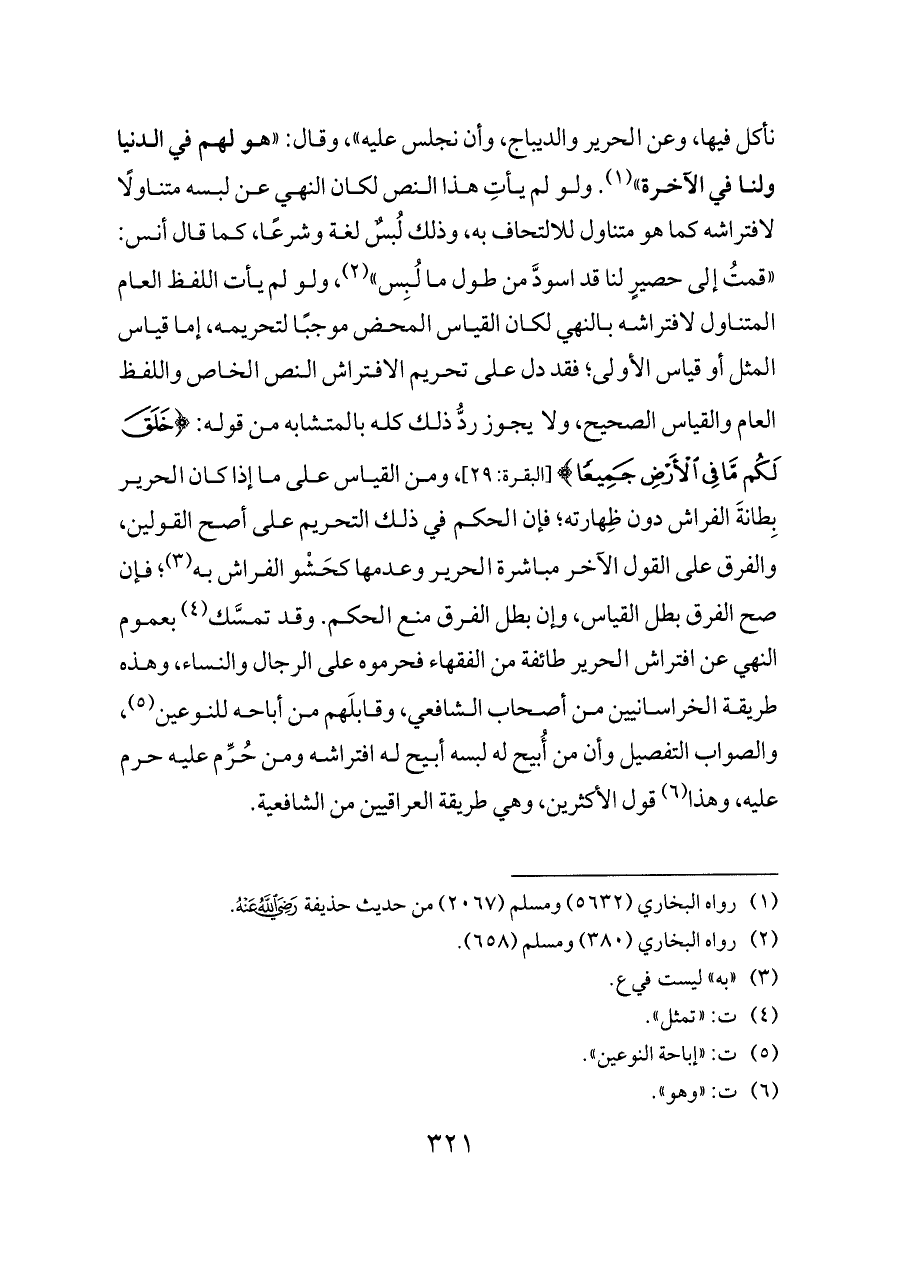 نأكل فيها، وعن الحرير والديباج، وأن نجلس عليه»، وقال: «هو لهم في الدنيا ولنا في الآخرة» (¬١). ولو لم يأتِ هذا النص لكان النهي عن لبسه متناولًا لافتراشه كما هو متناول للالتحاف به، وذلك لُبسٌ لغة وشرعًا، كما قال أنس: «قمتُ إلى حصيرٍ لنا قد اسودَّ من طول ما لُبِس» (¬٢)، ولو لم يأت اللفظ العام المتناول لافتراشه بالنهي لكان القياس المحض موجبًا لتحريمه، إما قياس المثل أو قياس الأولى؛ فقد دل على تحريم الافتراش النص الخاص واللفظ العام والقياس الصحيح، ولا يجوز ردُّ ذلك كله بالمتشابه من قوله: {خَلَقَ لَكُمْ مَا فِي الْأَرْضِ جَمِيعًا} [البقرة: ٢٩]، ومن القياس على ما إذا كان الحرير بِطانةَ الفراش دون ظِهارته؛ فإن الحكم في ذلك التحريم على أصح القولين، والفرق على القول الآخر مباشرة الحرير وعدمها كحَشْو الفراش به (¬٣)؛ فإن صح الفرق بطل القياس، وإن بطل الفرق منع الحكم. وقد تمسَّك (¬٤) بعموم النهي عن افتراش الحرير طائفة من الفقهاء فحرموه على الرجال والنساء، وهذه طريقة الخراسانيين من أصحاب الشافعي، وقابلَهم من أباحه للنوعين (¬٥)، والصواب التفصيل وأن من أُبيح له لبسه أبيح له افتراشه ومن حُرِّم عليه حرم عليه، وهذا (¬٦) قول الأكثرين، وهي طريقة العراقيين من الشافعية.