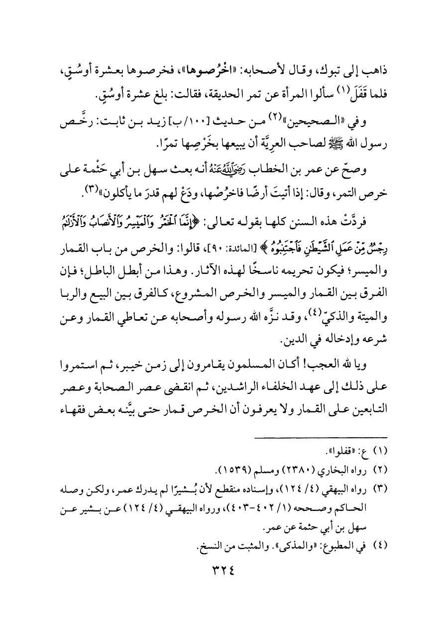 ويا لله العجب! أكان المسلمون يقامرون إلى زمن خيبر، ثم استمروا على ذلك إلى عهد الخلفاء الراشدين، ثم انقضى عصر الصحابة وعصر التابعين على القمار ولا يعرفون أن الخرص قمار حتى بيَّنه بعض فقهاء