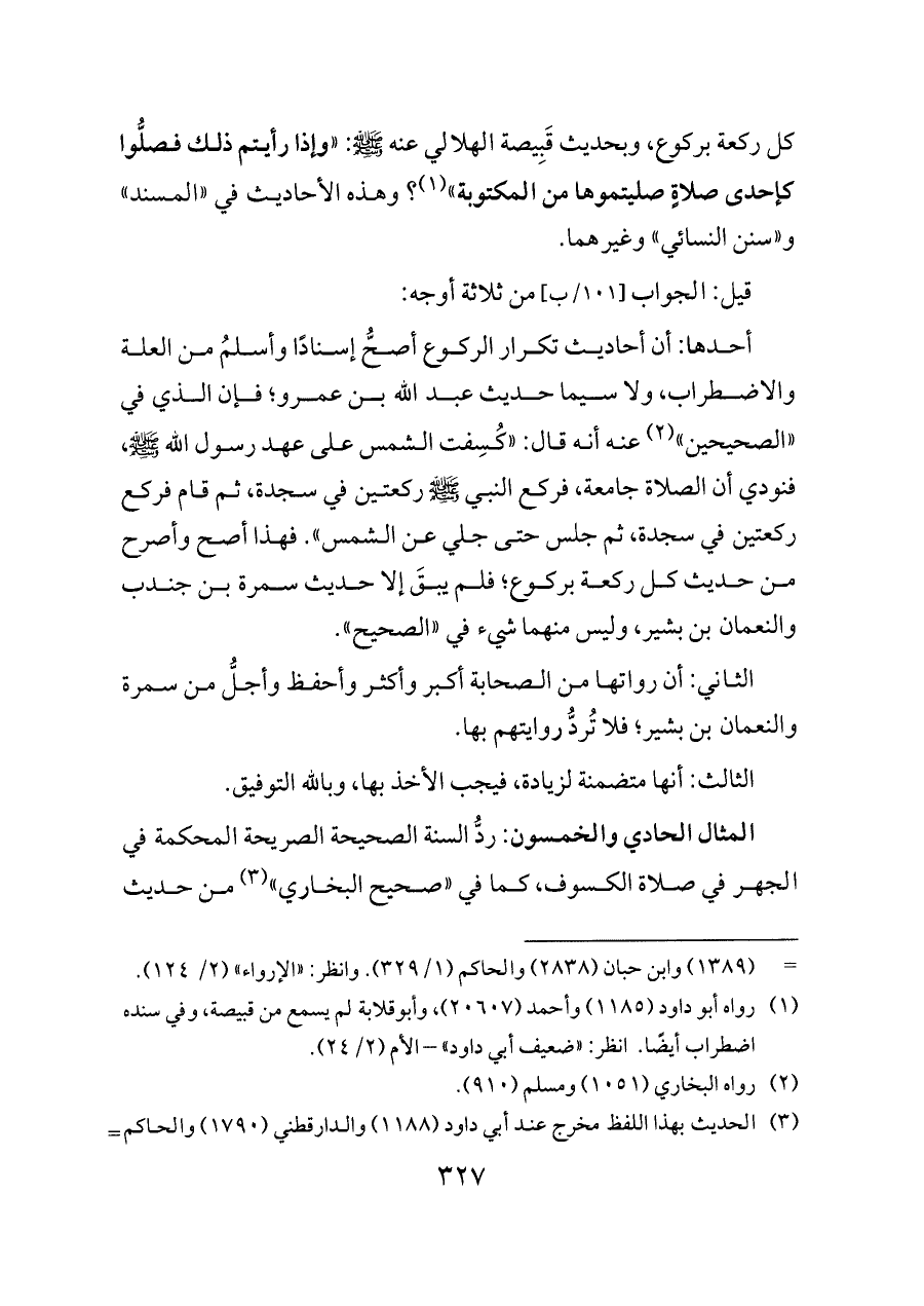 أحدها: أن أحاديث تكرار الركوع أصحُّ إسنادًا وأسلمُ من العلة والاضطراب، ولا سيما حديث عبد الله بن عمرو؛ فإن الذي في «الصحيحين» (¬٢) عنه أنه قال: «كُسِفت الشمس على عهد رسول الله - صلى الله عليه وسلم -، فنودي أن الصلاة جامعة، فركع النبي - صلى الله عليه وسلم - ركعتين في سجدة، ثم قام فركع ركعتين في سجدة، ثم جلس حتى جلي عن الشمس». فهذا أصح وأصرح من حديث كل ركعة بركوع؛ فلم يبقَ إلا حديث سمرة بن جندب والنعمان بن بشير، وليس منهما شيء في «الصحيح».