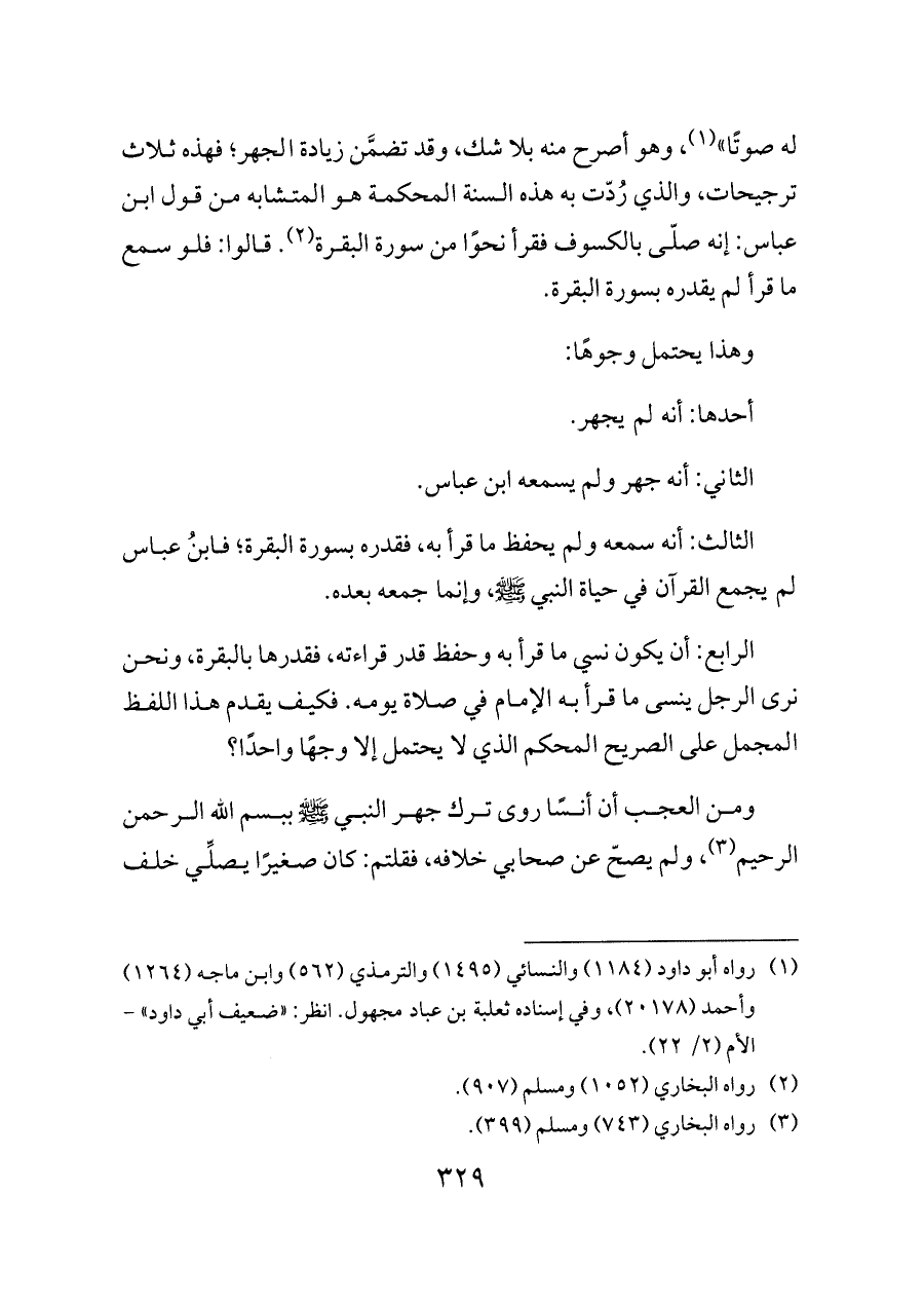 له صوتًا» (¬١)، وهو أصرح منه بلا شك، وقد تضمَّن زيادة الجهر؛ فهذه ثلاث ترجيحات، والذي رُدّت به هذه السنة المحكمة هو المتشابه من قول ابن عباس: إنه صلّى بالكسوف فقرأ نحوًا من سورة البقرة (¬٢). قالوا: فلو سمع ما قرأ لم يقدره بسورة البقرة.