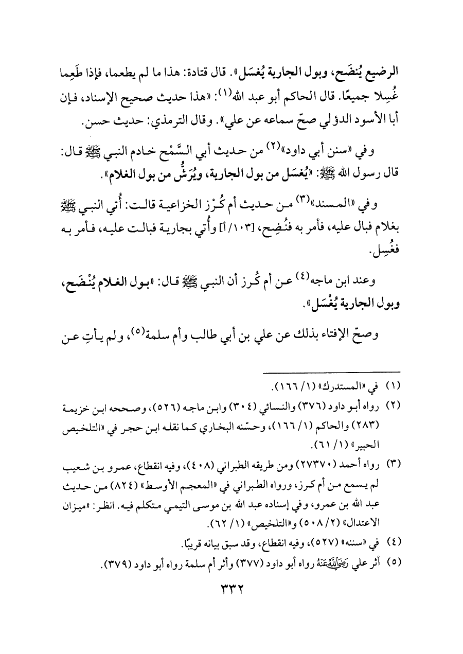 الرضيع يُنضَح، وبول الجارية يُغسَل». قال قتادة: هذا ما لم يطعما، فإذا طَعِما غُسِلا جميعًا. قال الحاكم أبو عبد الله (¬١): «هذا حديث صحيح الإسناد، فإن أبا الأسود الدؤلي صحّ سماعه عن علي». وقال الترمذي: حديث حسن.