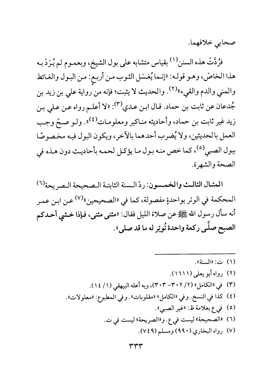 فرُدَّتْ هذه السنن (¬١) بقياس متشابه على بول الشيخ، وبعموم لم يُرَدْ به هذا الخاصّ، وهو قوله: «إنما يُغسَل الثوب من أربعٍ: من البول والغائط والمني والدم والقيء» (¬٢). والحديث لا يثبت؛ فإنه من رواية علي بن زيد بن جُدعان عن ثابت بن حماد. قال ابن عدي (¬٣): «لا أعلم رواه عن علي بن زيد غير ثابت بن حماد، وأحاديثه مناكير ومعلومات (¬٤)». ولو صحّ وجب العمل بالحديثين، ولا يُضرب أحدهما بالآخر، ويكون البول فيه مخصوصًا ببول الصبي (¬٥)، كما خص منه بول ما يؤكل لحمه بأحاديث دون هذه في الصحة والشهرة.