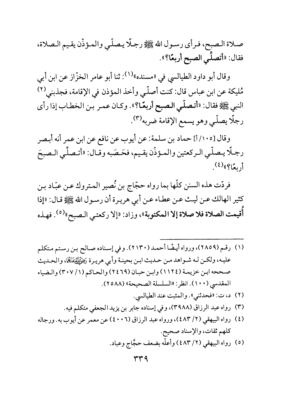 وقال [١٠٥/أ] حماد بن سلمة: عن أيوب عن نافع عن ابن عمر أنه أبصر رجلًا يصلّي الركعتين والمؤذّن يقيم، فحَصَبه وقال: «أتصلِّي الصبحَ أربعًا؟» (¬٤).