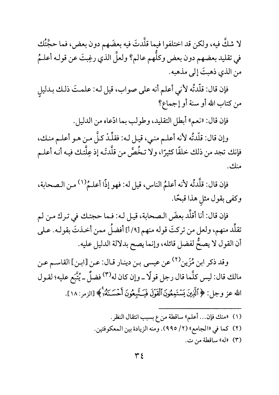 لا شكَّ فيه، ولكن قد اختلفوا فيما قلَّدتَ فيه بعضَهم دون بعض، فما حجَّتُك في تقليد بعضهم دون بعض وكلُّهم عالم؟ ولعلَّ الذي رغِبتَ عن قوله أعلمُ من الذي ذهبتَ إلى مذهبه.
