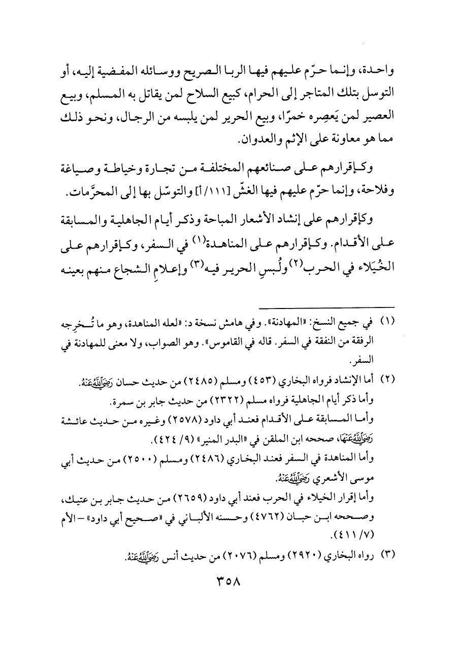 وكإقرارهم على إنشاد الأشعار المباحة وذكر أيام الجاهلية والمسابقة على الأقدام. وكإقرارهم على المناهدة (¬١) في السفر، وكإقرارهم على الخُيَلاء في الحرب (¬٢) ولُبسِ الحرير فيه (¬٣) وإعلامِ الشجاع منهم بعينه