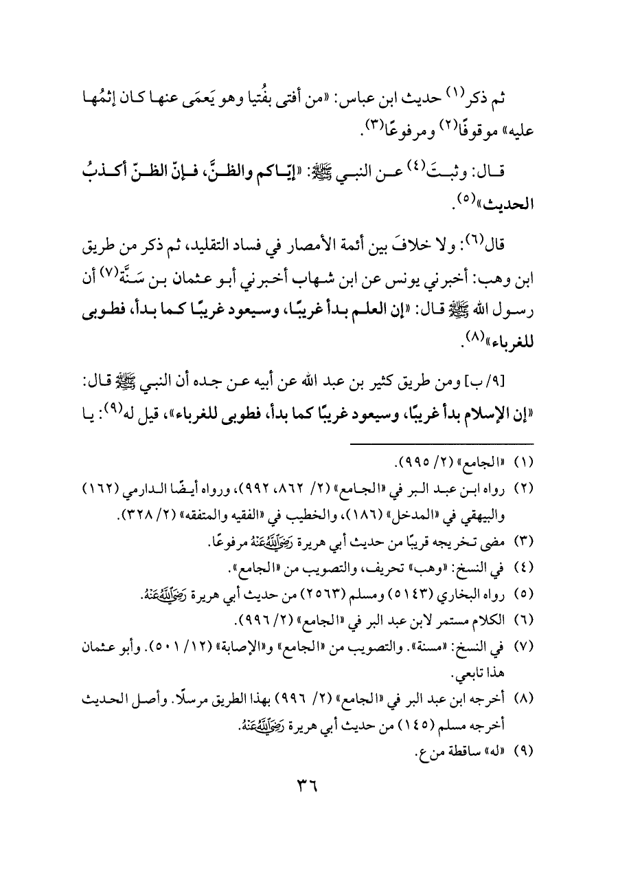 قال (¬٦): ولا خلافَ بين أئمة الأمصار في فساد التقليد، ثم ذكر من طريق ابن وهب: أخبرني يونس عن ابن شهاب أخبرني أبو عثمان بن سَنَّة (¬٧) أن رسول الله - صلى الله عليه وسلم - قال: «إن العلم بدأ غريبًا، وسيعود غريبًا كما بدأ، فطوبى للغرباء» (¬٨).