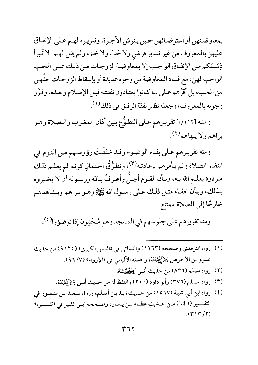 ومنه تقريرهم على جلوسهم في المسجد وهم مُجْنِبون إذا توضؤوا (¬٤).