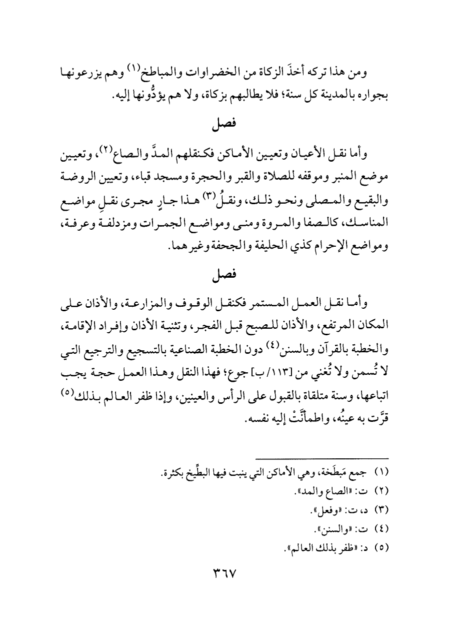 وأما نقل العمل المستمر فكنقل الوقوف والمزارعة، والأذان على المكان المرتفع، والأذان للصبح قبل الفجر، وتثنية الأذان وإفراد الإقامة، والخطبة بالقرآن وبالسنن (¬٤) دون الخطبة الصناعية بالتسجيع والترجيع التي لا تُسمن ولا تُغني من [١١٣/ب] جوع؛ فهذا النقل وهذا العمل حجة يجب اتباعها، وسنة متلقاة بالقبول على الرأس والعينين، وإذا ظفر العالم بذلك (¬٥) قرَّت به عينُه، واطمأنَّتْ إليه نفسه.