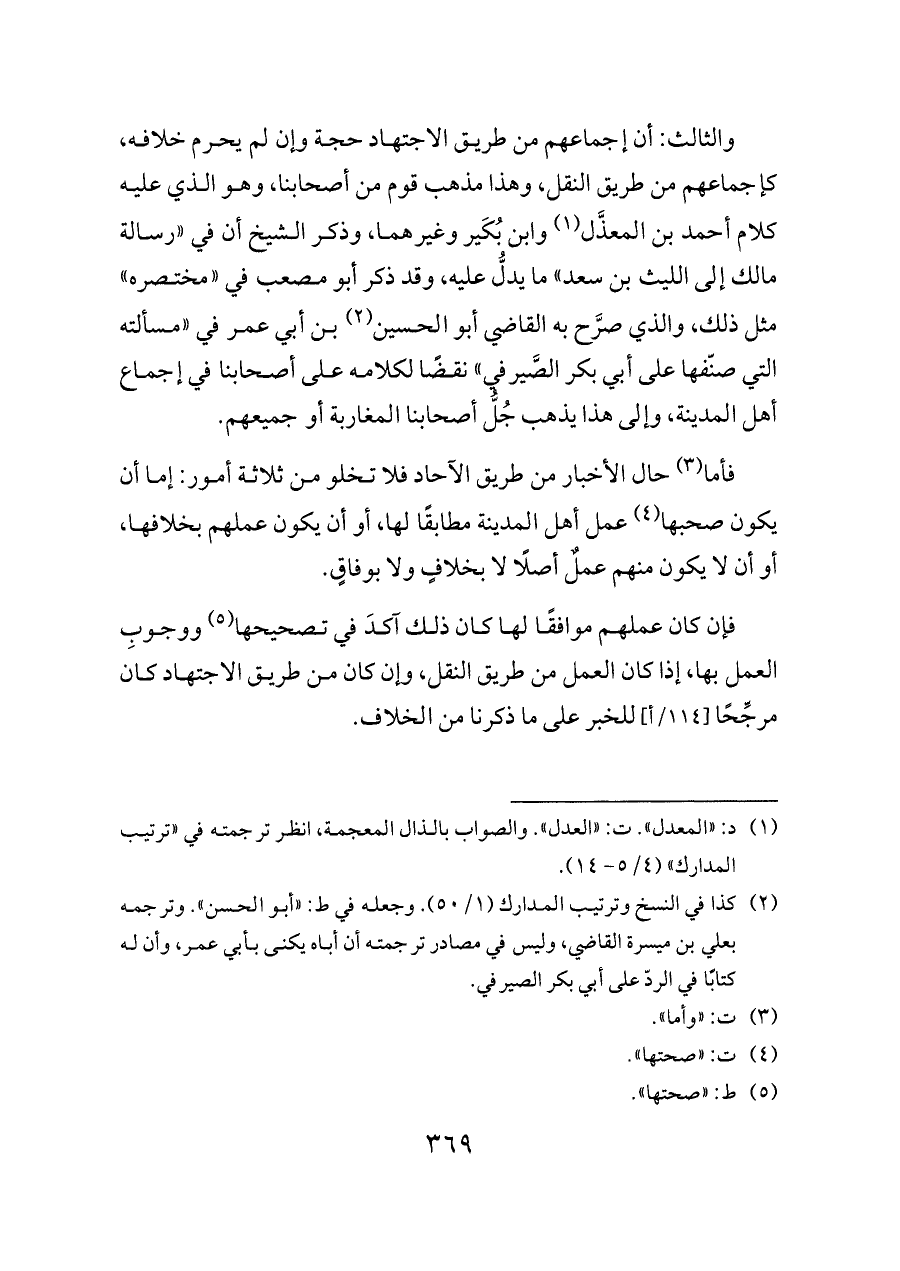 والثالث: أن إجماعهم من طريق الاجتهاد حجة وإن لم يحرم خلافه، كإجماعهم من طريق النقل، وهذا مذهب قوم من أصحابنا، وهو الذي عليه كلام أحمد بن المعذَّل (¬١) وابن بُكَير وغيرهما، وذكر الشيخ أن في «رسالة مالك إلى الليث بن سعد» ما يدلُّ عليه، وقد ذكر أبو مصعب في «مختصره» مثل ذلك، والذي صرَّح به القاضي أبو الحسين (¬٢) بن أبي عمر في «مسألته التي صنّفها على أبي بكر الصَّيرفي» نقضًا لكلامه على أصحابنا في إجماع أهل المدينة، وإلى هذا يذهب جُلُّ أصحابنا المغاربة أو جميعهم.