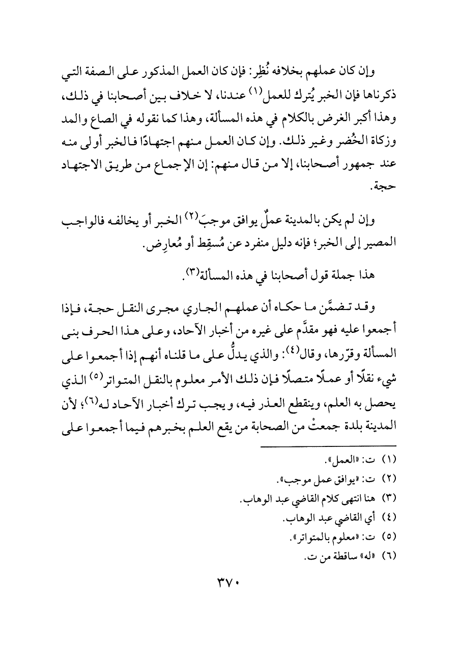 وقد تضمَّن ما حكاه أن عملهم الجاري مجرى النقل حجة، فإذا أجمعوا عليه فهو مقدَّم على غيره من أخبار الآحاد، وعلى هذا الحرف بنى المسألة وقرّرها، وقال (¬٤): والذي يدلُّ على ما قلناه أنهم إذا أجمعوا على شيء نقلًا أو عملًا متصلًا فإن ذلك الأمر معلوم بالنقل المتواتر (¬٥) الذي يحصل به العلم، وينقطع العذر فيه، ويجب ترك أخبار الآحاد له (¬٦)؛ لأن المدينة بلدة جمعتْ من الصحابة من يقع العلم بخبرهم فيما أجمعوا على
