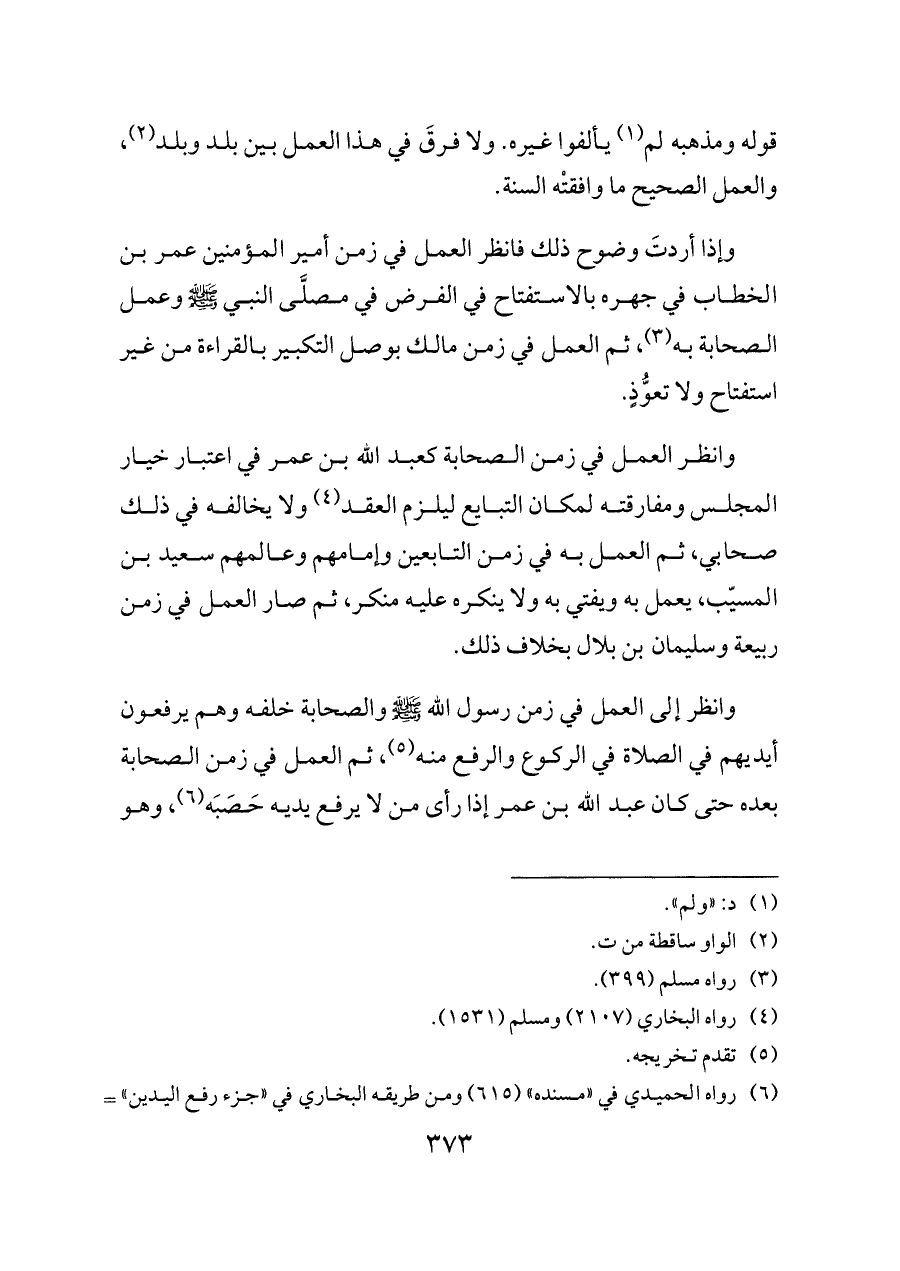 وانظر إلى العمل في زمن رسول الله - صلى الله عليه وسلم - والصحابة خلفه وهم يرفعون أيديهم في الصلاة في الركوع والرفع منه (¬٥)، ثم العمل في زمن الصحابة بعده حتى كان عبد الله بن عمر إذا رأى من لا يرفع يديه حَصَبَه (¬٦)، وهو